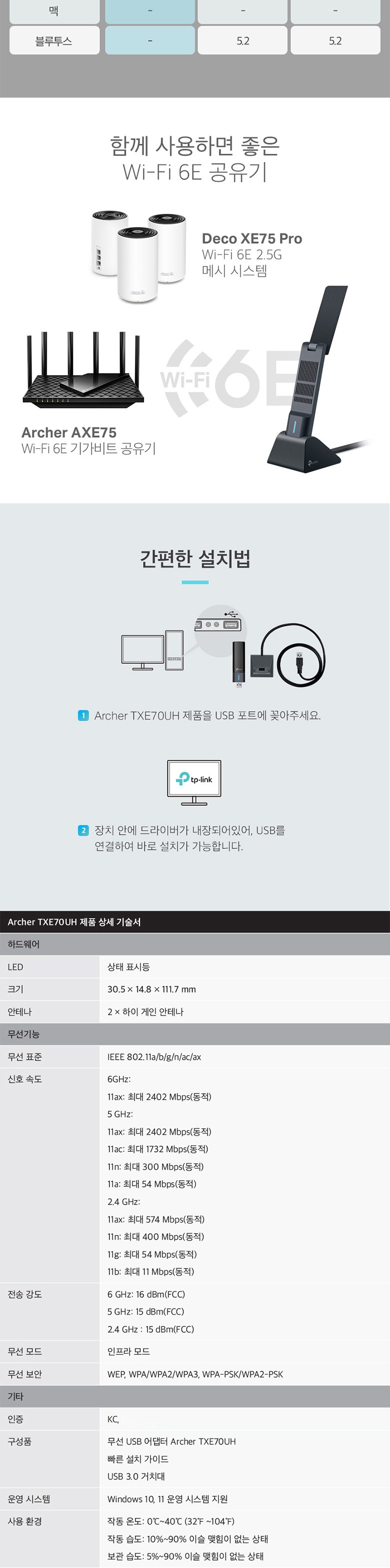| 품명 및 모델명 | 티피링크 AXE5400 하이 게인 Wi-Fi 6E USB 어댑터 무선 랜카드/Archer TXE70UH | KC 인증정보 | R-R-tPC-ArcherTXE70UH |