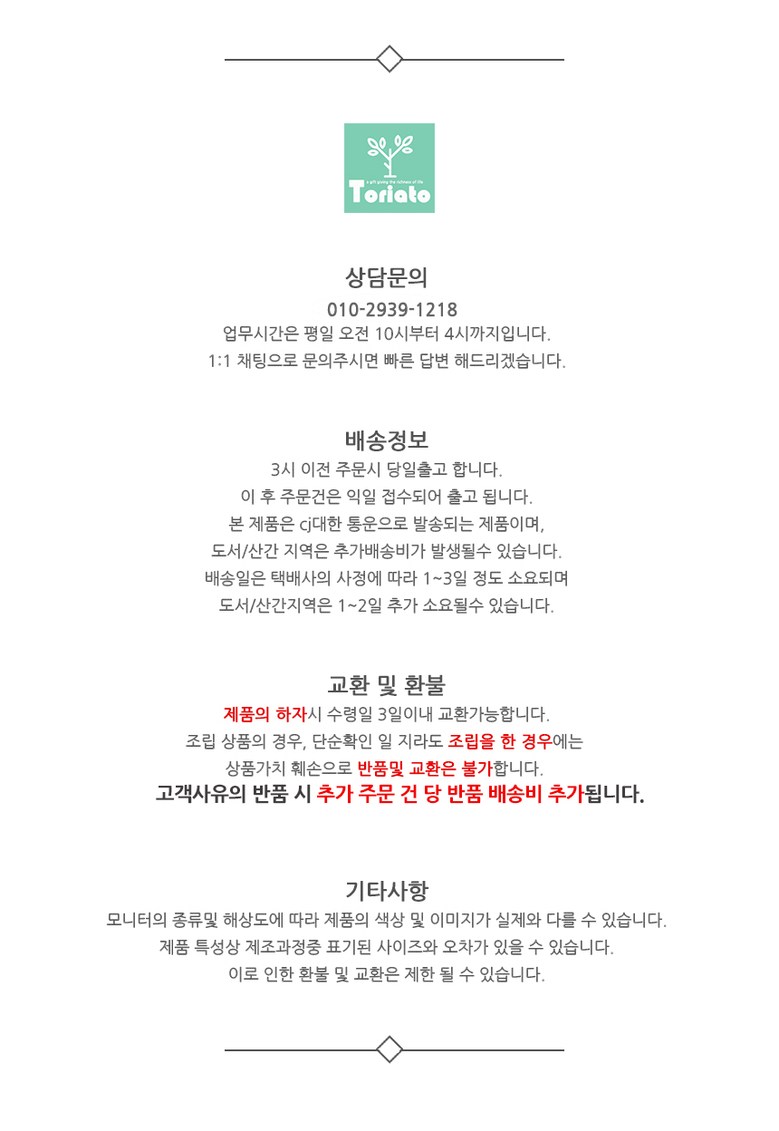 - ㆍ모니터 해상도의 차이로 인해 색상이나 이미지가 실제와 달라, 고객이 단순 변심으로 교환/반품을 무료로 요청하는 경우