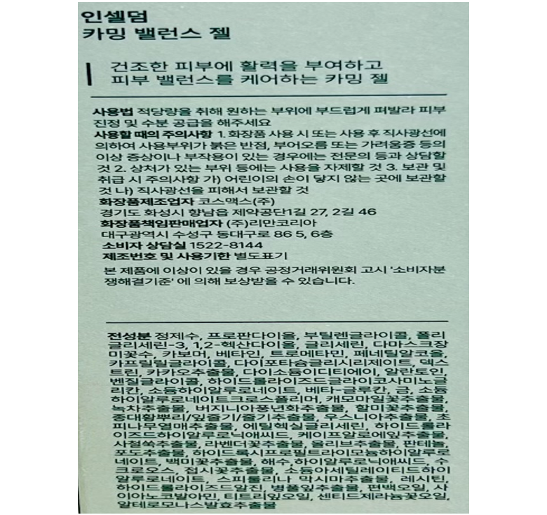 | 화장품제조업자, 화장품책임판매업자 및 맞춤형화장품판매업자 | 코스맥스(주), (주)리만코리아 | 제조국 | 대한민국 |