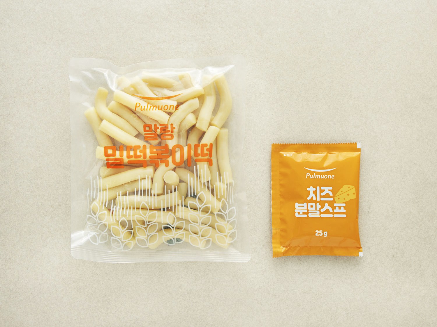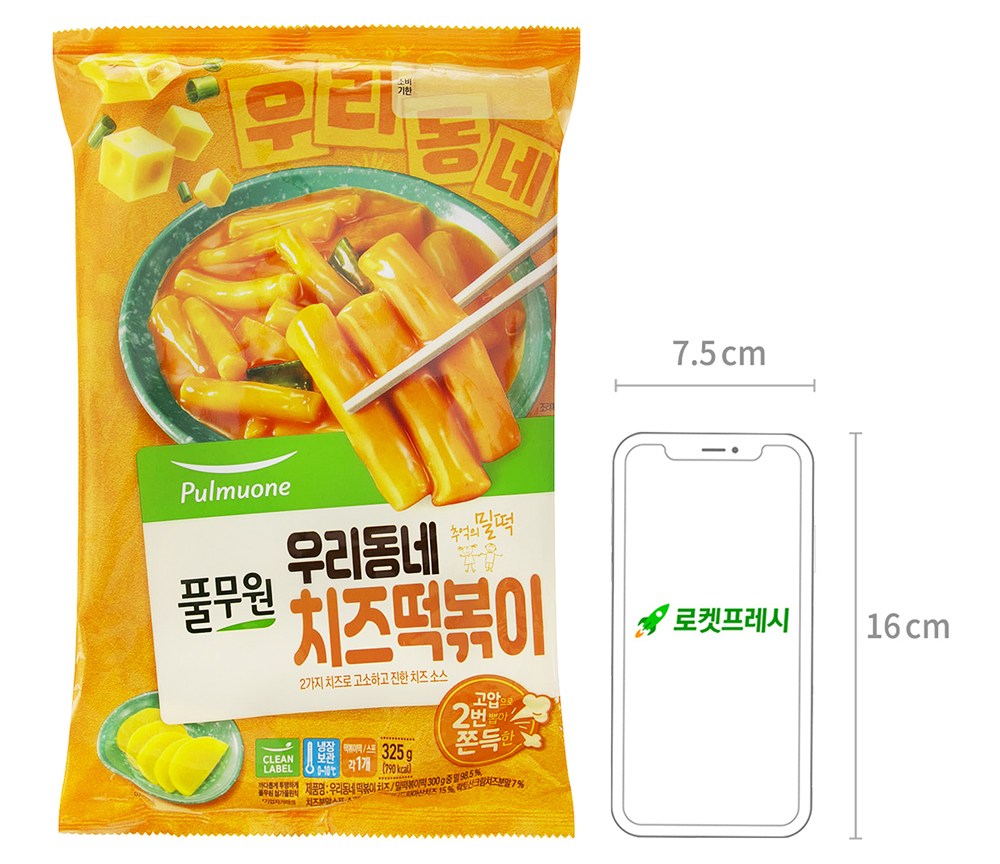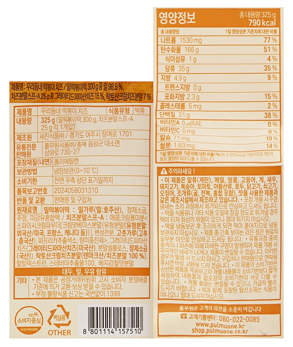 밀 떡볶이 떡, 치즈 분말스프로 구성되어 있습니다.