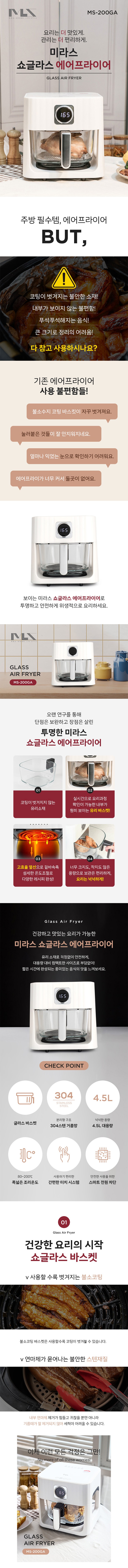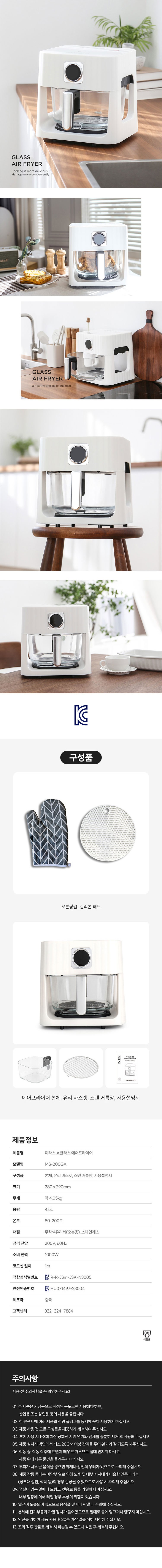 | 품명 및 모델명 | 미라스 쇼글라스 에어프라이어 4.5L/ MS-200GA | KC 인증정보 | HU071497-23004D, R-R-JSm-JSK-N3005 |