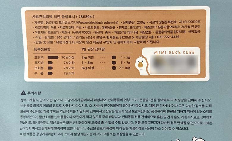 | 품명 및 모델명 | 동결건조 오리큐브 미니(Freeze dried duck cube mini) | 인증사항 | 사료관리법에 따른 성분등록번호 : 컨텐츠 참조 |