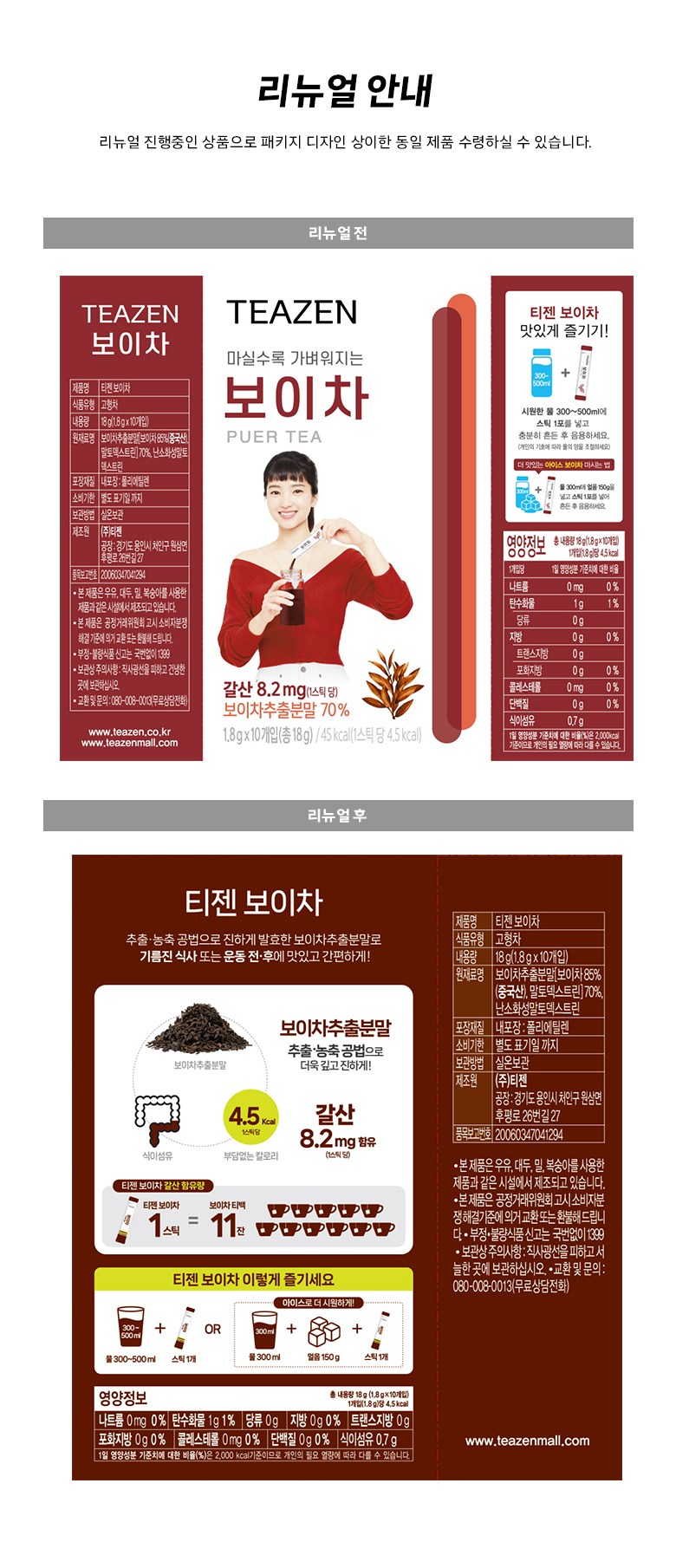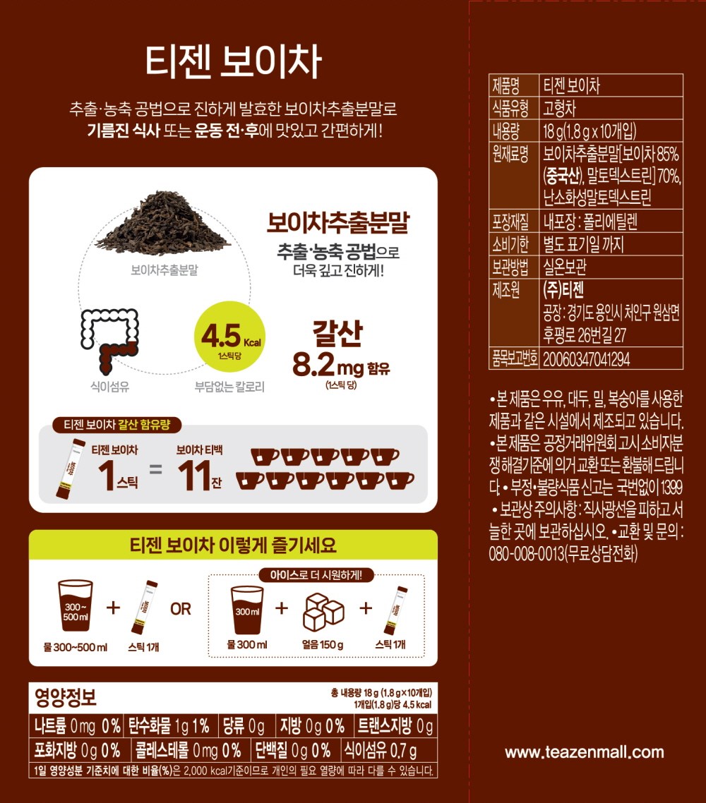 | 제품명 | 티젠 보이차 | 식품의 유형 | 고형차 |