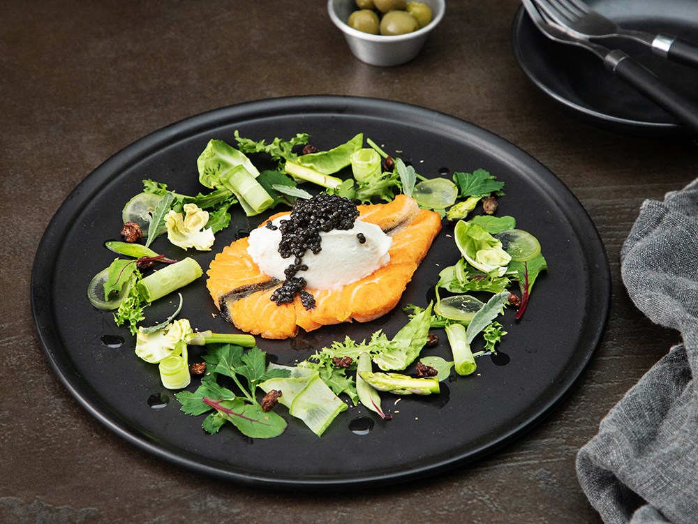 캐비어를 곁들인 연어구이 샐러드