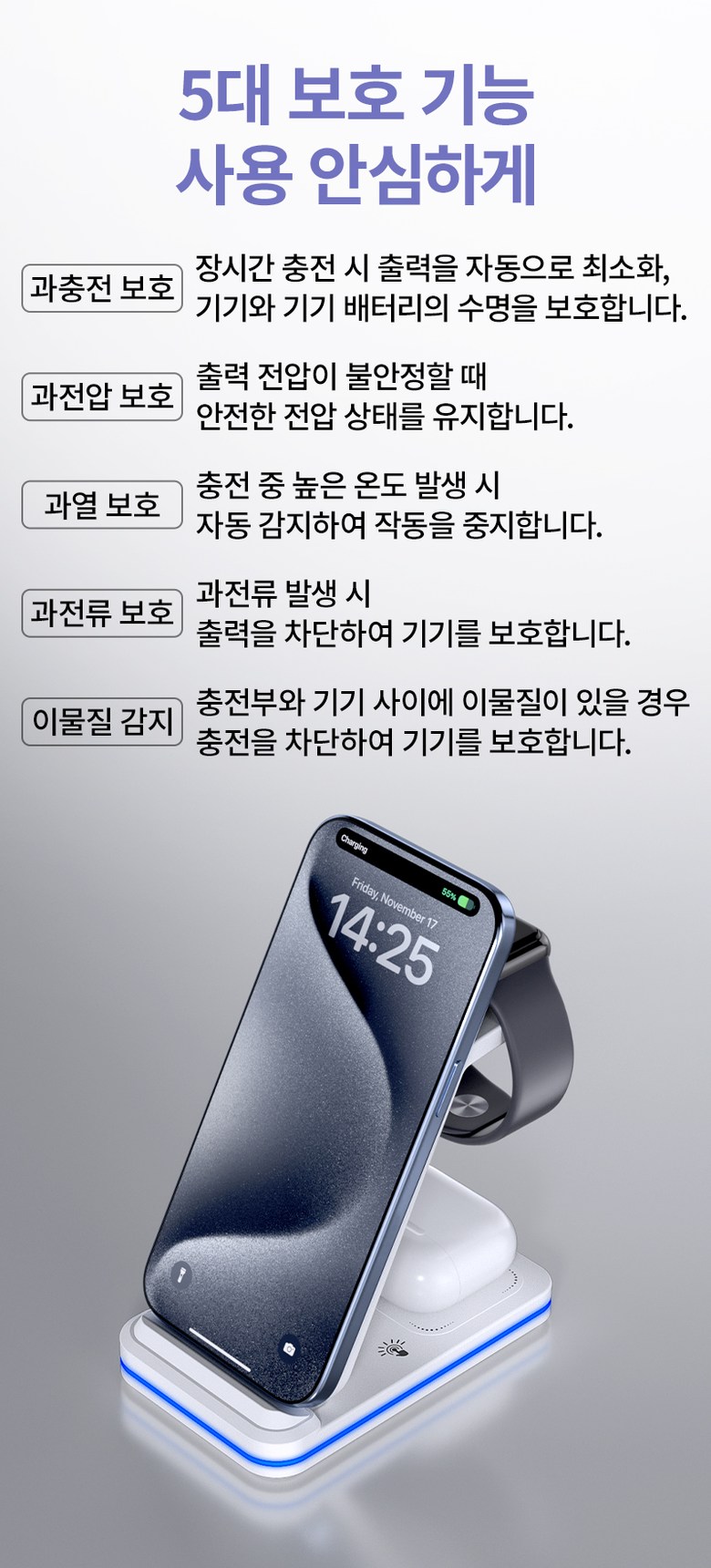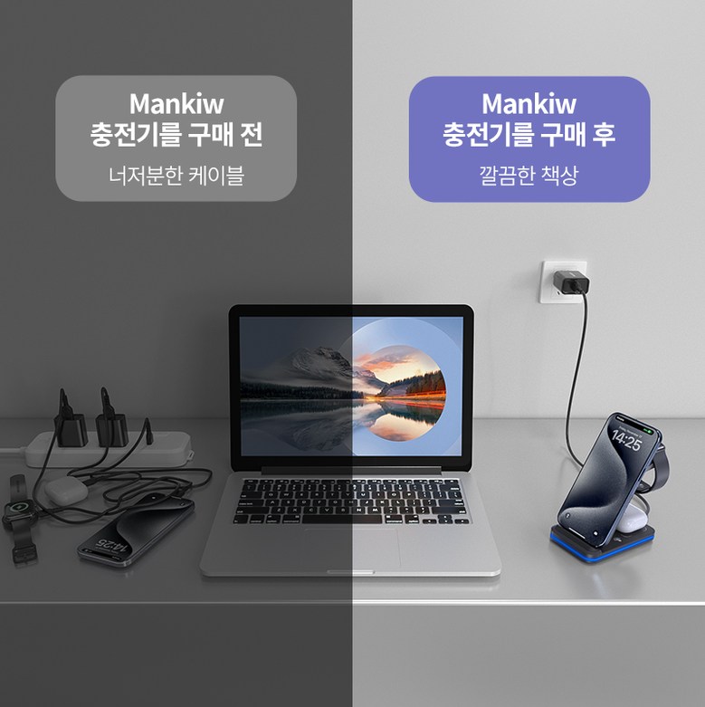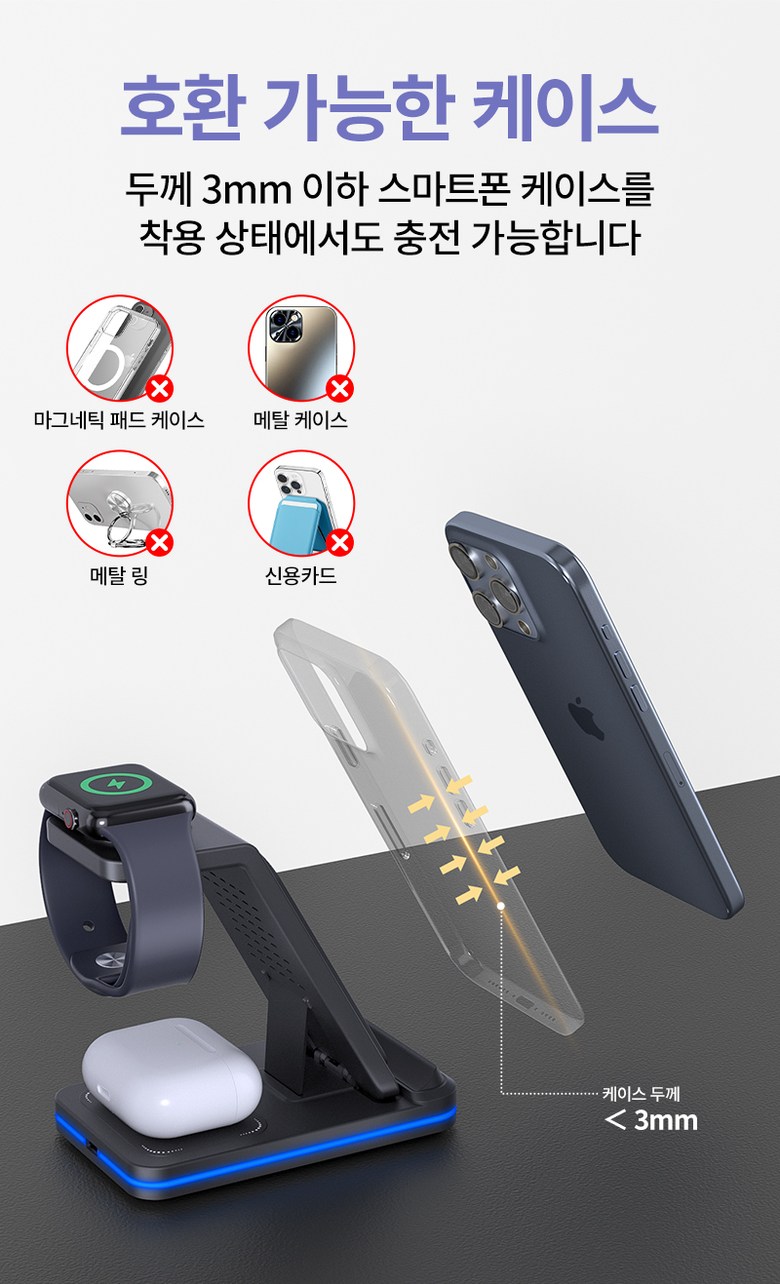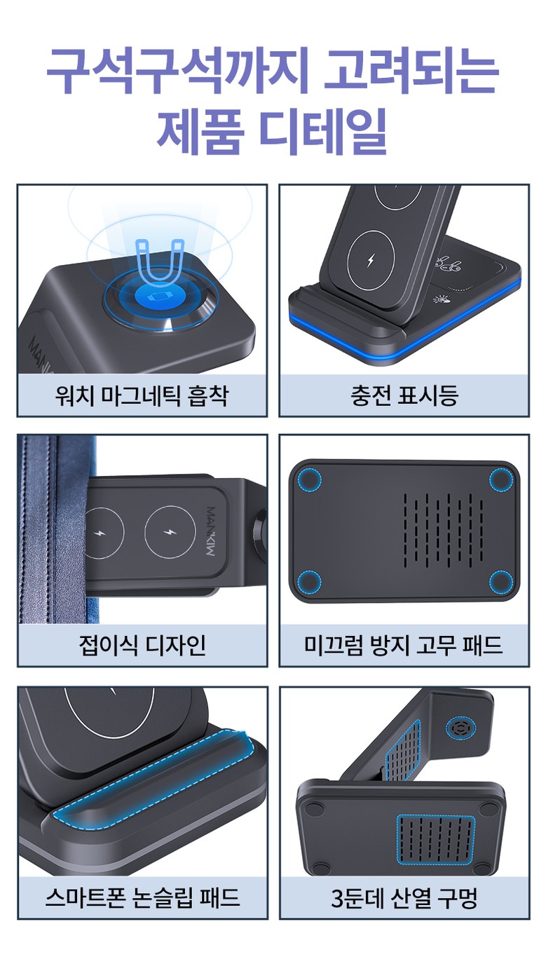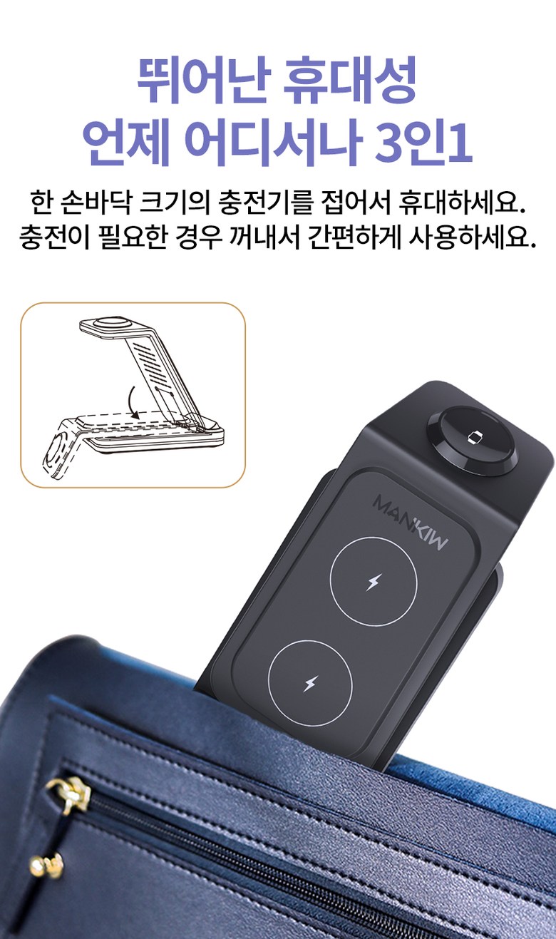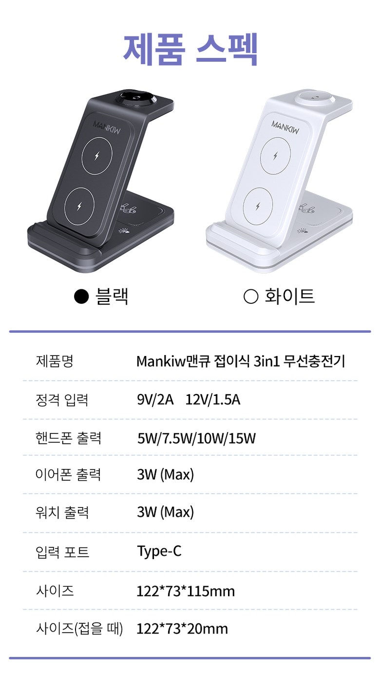 | 품명 및 모델명 | Mankiw맨큐 애플워치 호환 3in1 무선충전기 / A100 | KC 인증정보 | 본품: R-R-HUY-A100 / 어댑터 : R-R-XY4-XY-2115-AC , HU10863-22013A |