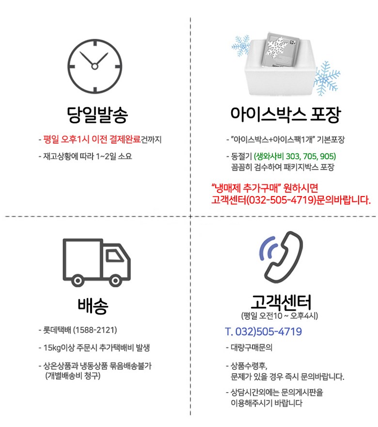 | 배송방법 | 신선/냉장/냉동 | 배송비 | 3,500원 · 도서산간 추가 배송비 - 제주 지역: 5,000원 - 도서산간 지역: 8,000원 |