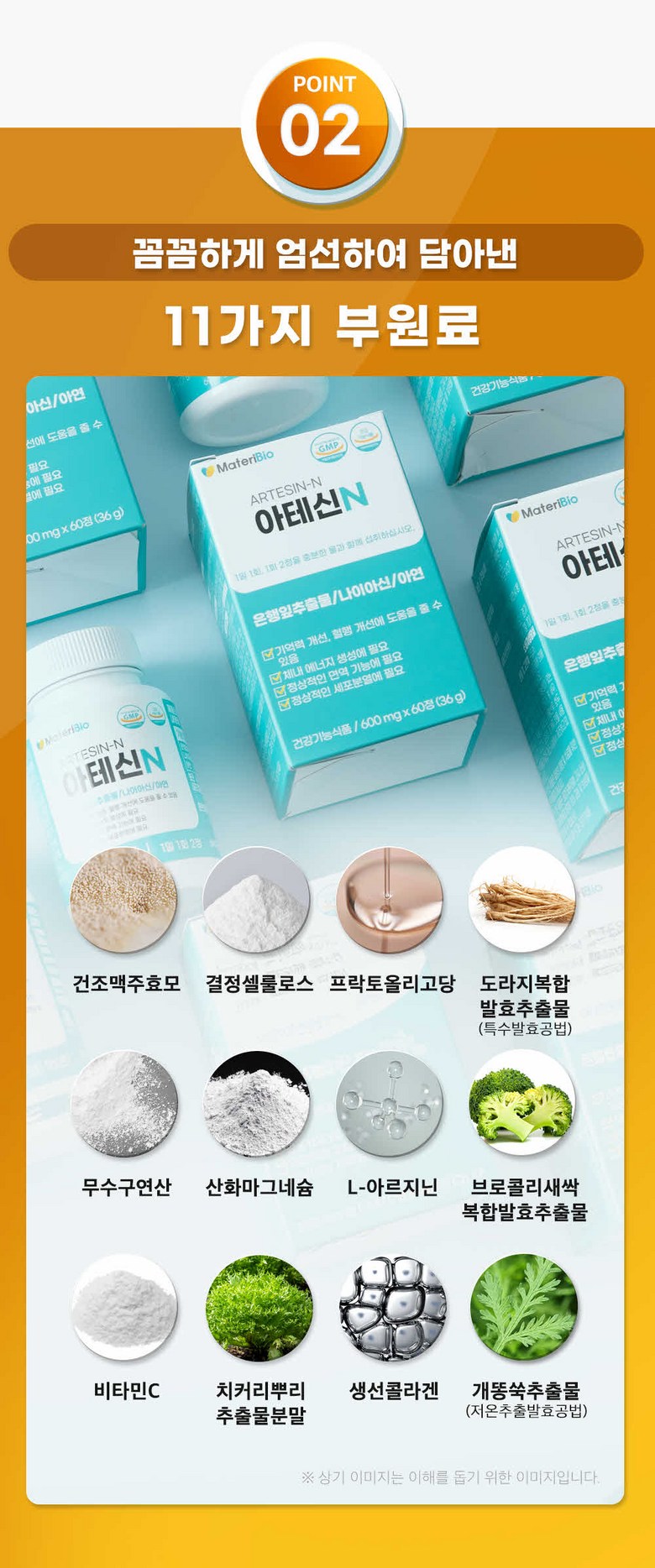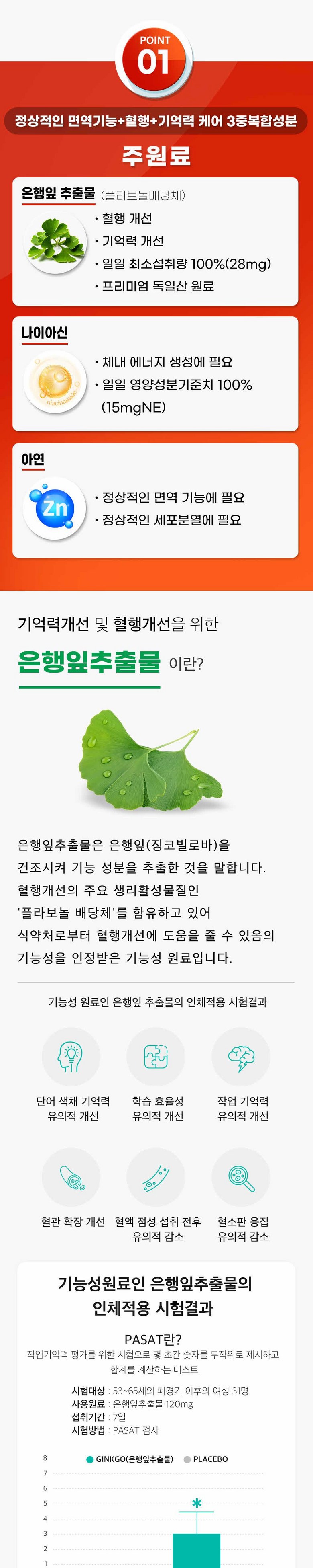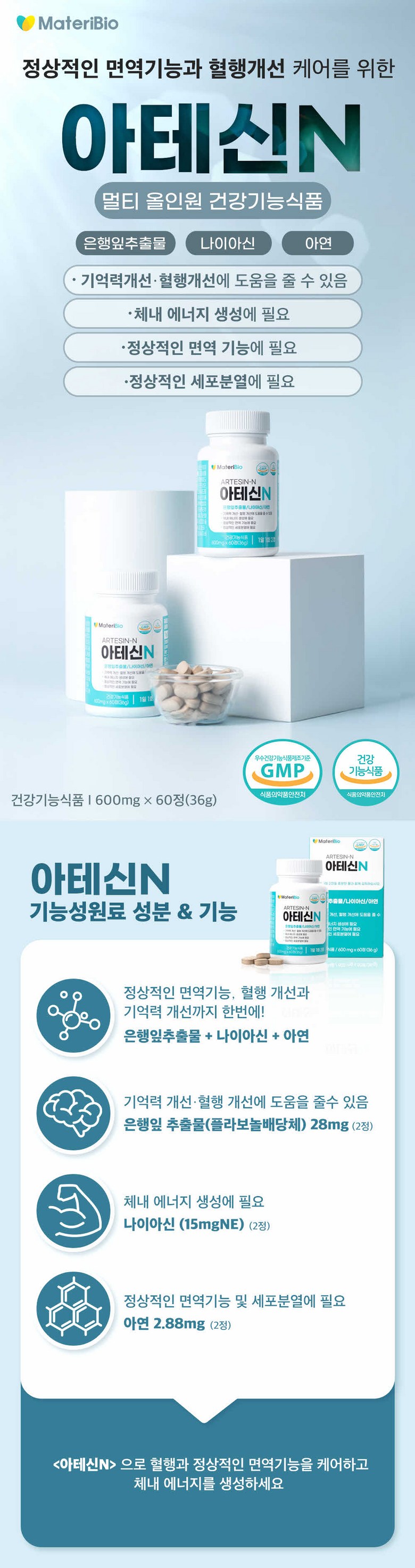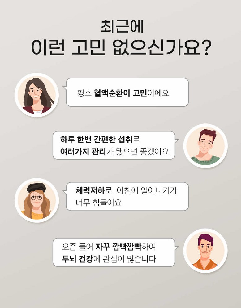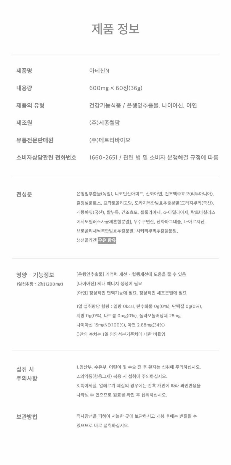 | 원료명 및 함량 | 농수산물의 원산지 표시에 관한 법률에 따른 개똥쑥(국산), 은행잎추출물(독일), 도라지복합발효추출분말[도라지뿌리](국산), 니코틴산아미드, 산화아연, 건조맥주효모(리투아니아), 결정셀룰로스, 프락토올리고당, 쌀누룩, 건조효모, 셀룰라아제, a-아밀라아제, 락토바실러스에시도필러스사균체혼합분말, 무수구연산, 산화마그네슘, L-아르지닌, 브로콜리새싹복합발효추출분말, 비타민C, 치커리뿌리추출물분말, 생선콜라겐원산지 표시 포함 | 영양정보 | 열량 0 Kcal, 탄수화물 0 g(0%), 단백질 0 g(0%), 지방 0 g(0%), 나트륨 0 mg(0%) |