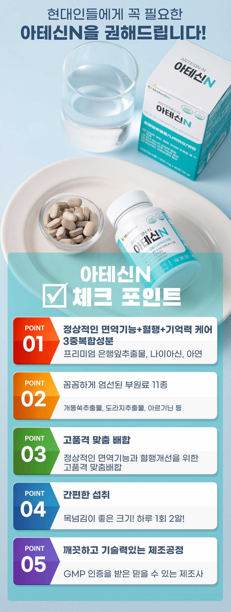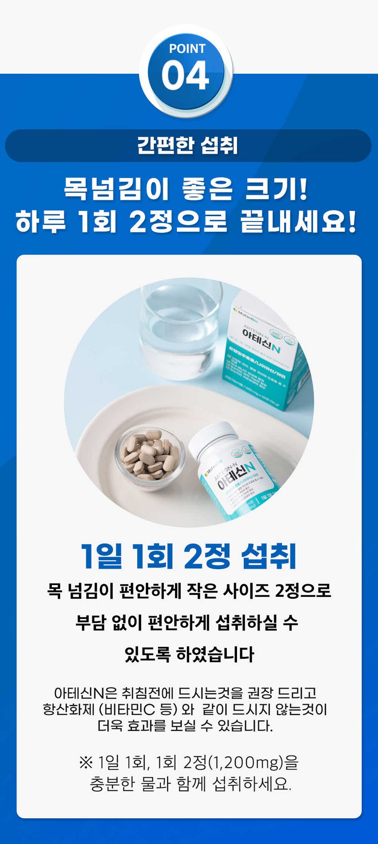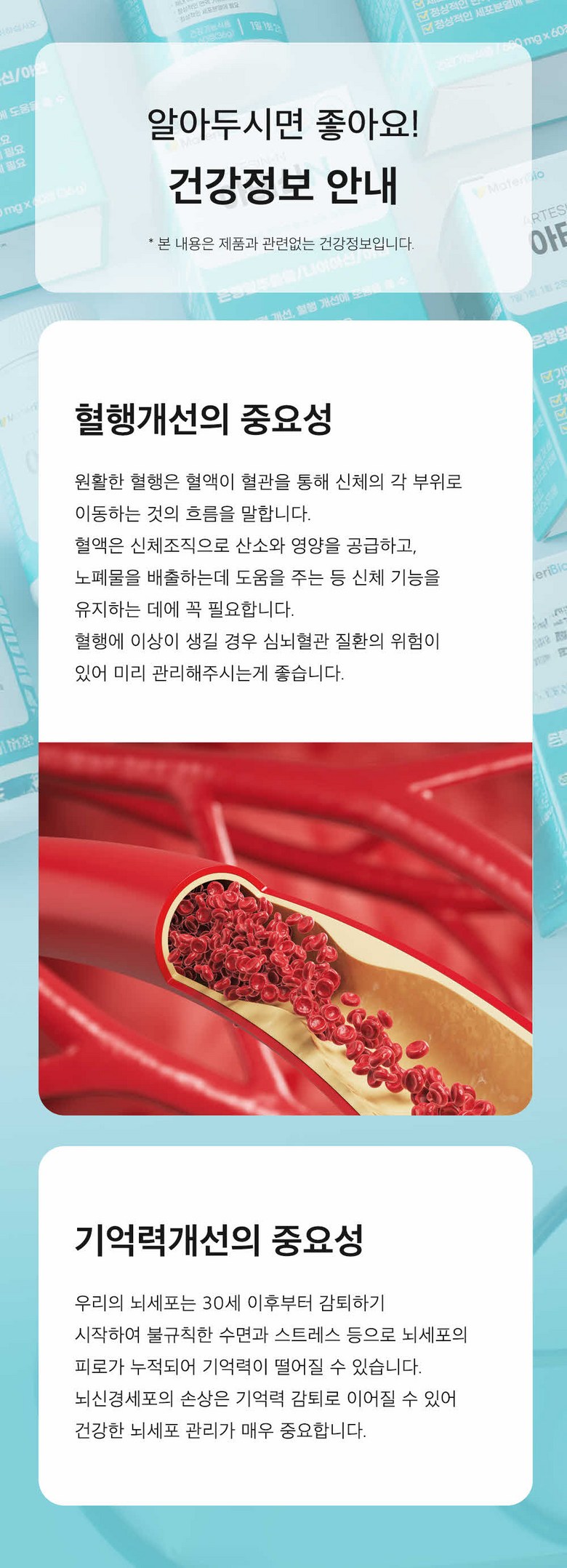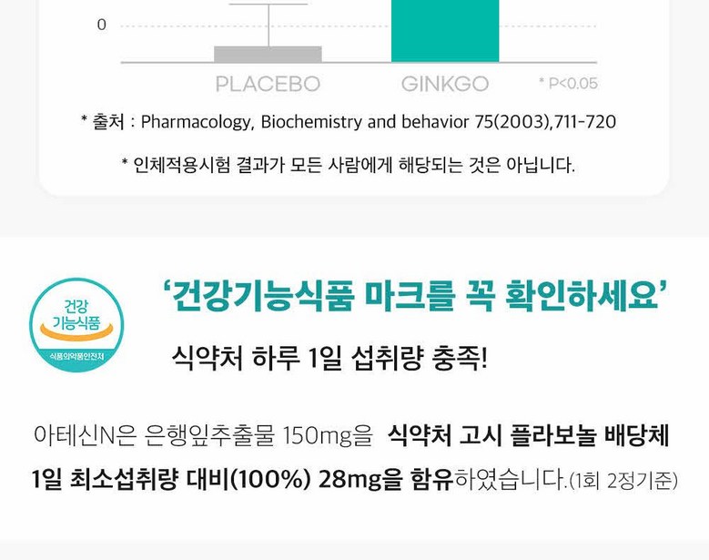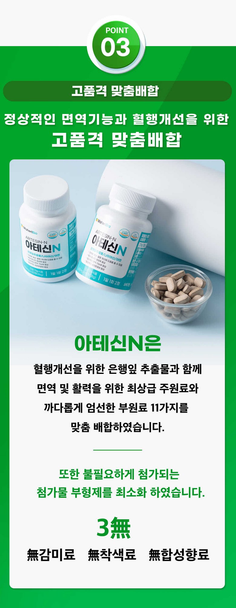 | 원료명 및 함량 | 농수산물의 원산지 표시에 관한 법률에 따른 개똥쑥(국산), 은행잎추출물(독일), 도라지복합발효추출분말[도라지뿌리](국산), 니코틴산아미드, 산화아연, 건조맥주효모(리투아니아), 결정셀룰로스, 프락토올리고당, 쌀누룩, 건조효모, 셀룰라아제, a-아밀라아제, 락토바실러스에시도필러스사균체혼합분말, 무수구연산, 산화마그네슘, L-아르지닌, 브로콜리새싹복합발효추출분말, 비타민C, 치커리뿌리추출물분말, 생선콜라겐원산지 표시 포함 | 영양정보 | 열량 0 Kcal, 탄수화물 0 g(0%), 단백질 0 g(0%), 지방 0 g(0%), 나트륨 0 mg(0%) |