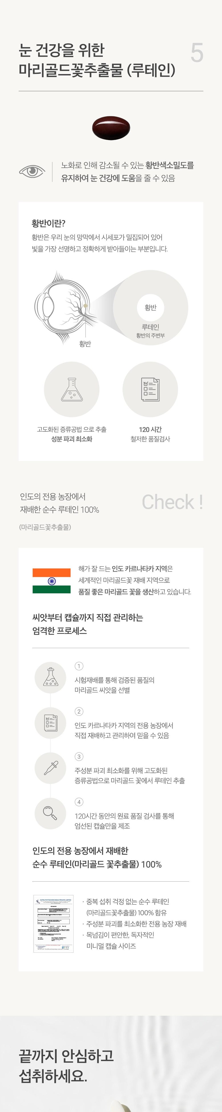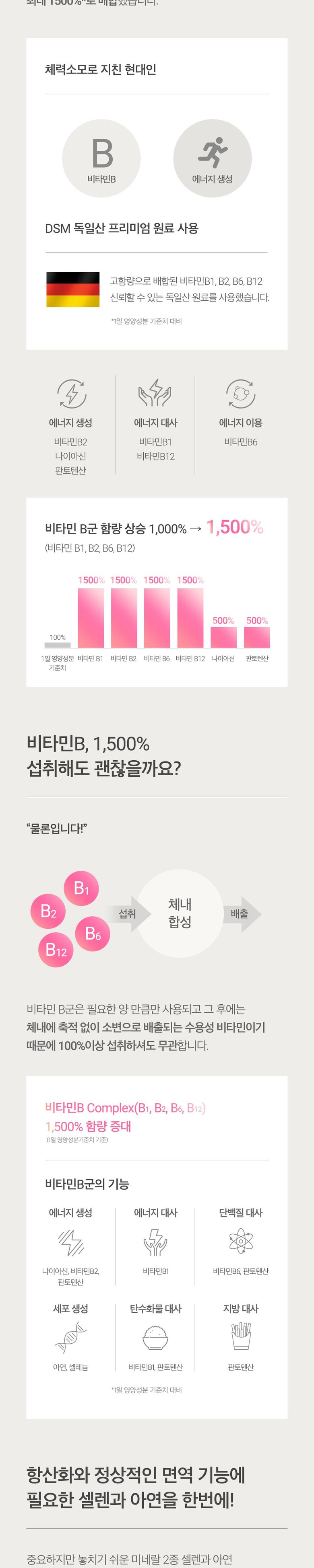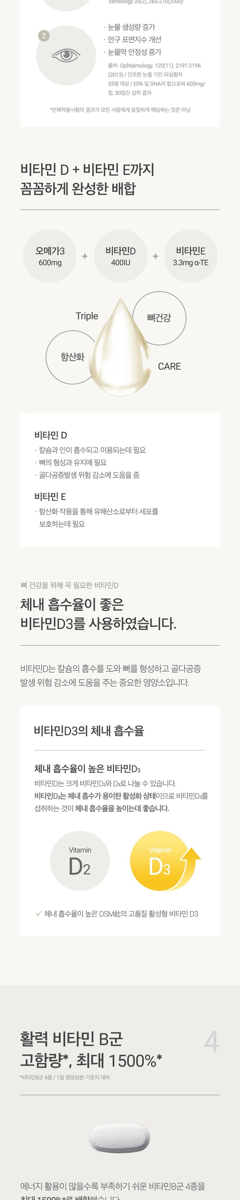 | 원료명 및 함량 | 「농수산물의 원 [분홍색정제] 히알루론산, 말토덱스트린, 결정셀룰로스, 카복시메틸셀룰로스칼슘, 히드록시프로필메틸셀룰로스, 스테아린산마그네슘, 이산화티타늄(착색료), 글리 세린지방산에스테르, 코치닐혼합색소 (코치닐추출색소, 치자황색소, 치자청색소) [흰색정제] 니코틴산아미드,글루콘산아연, 판토텐산칼슘, 비타민B6염산염, 비타민B2, 비타민B1 질산염, 아셀렌산나트륨,비타민B12혼합제제(비타민B12, 제이인산칼슘),결정셀 룰로스, 히드록시프로필메틸셀룰로스, 가교카복시메틸셀룰로스나트륨, 스테아린 산, 스테아린산마그네슘, 이산화티타늄(착색료) ,이산화규소, 글리세린지방산에 스테르 [녹색연질캡슐] 코엔자임Q10, 아마씨유(독일산), 밀납(황납), 대두레시틴 [캡슐기제] 젤라틴(돈피), 폴리글리시톨시럽, 글리세린, 심황색소, 치자청색소 [적 갈색연질캡슐] 마리골드꽃추출물(인도산), 해바라기유 [캡슐기제] 젤라틴(돈피), 폴리글리시톨시럽, 글리세린, 안나토색소, 치자청색소 [투명한연질캡슐] EPA 및 DHA 함유유지(미국산), d-α-토코페롤, 비타민D3, 레몬향유지 [캡슐기제] 젤라틴(우피), 글리세 린, 폴리글리시톨시럽, 무수구연산, 에틸바닐린 대두, 돼지고기, 쇠고기, 고등어 함유산지 표시 등에 관한 법률」에 따른 원산지 표시 포함 | 영양정보 | 1일 섭취량 당 함량 : 열량 15 kcal, 탄수화물 1 g 미만 (0 %), 단백질 0 g (0 %), 지방 1 g (2 %), 나트륨 0 mg (0 %), 비타민E 3.3 mg α-TE(30 %), 비타민D 10 µg(100 %), 비타민B1 18 mg(1,500 %), 비타민B2 21 mg(1,500 %), 나이아신 75 mgNE(500 %), 비타민B6 22.5 mg(1,500 %), 비타민B12 36 µg(1,500 %), 판토텐산 25 mg(500 %), 아연 8.5 mg(100 %), 셀렌 55 µg (100 %), 히알루론산 120 mg, EPA와 DHA의 합 600 mg, 루테인 20 mg, 코엔자임Q10 90 mg |