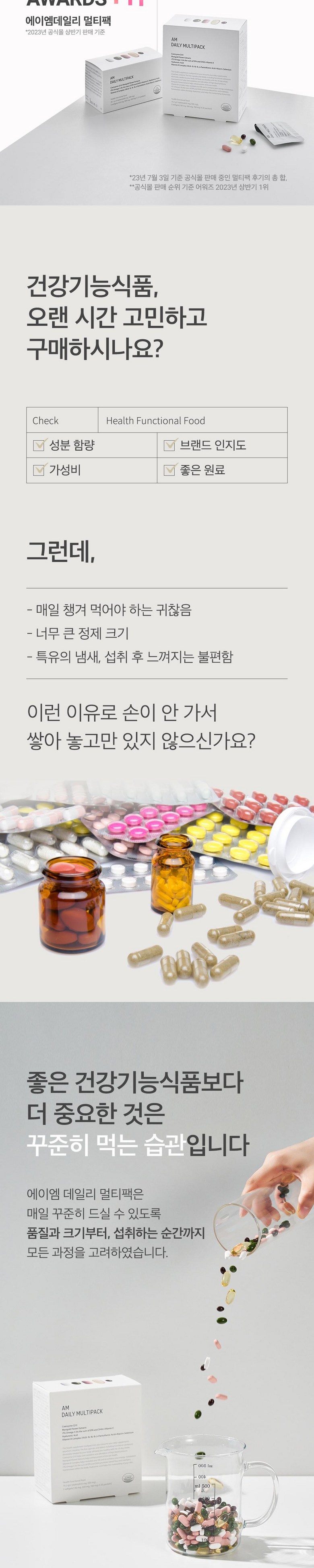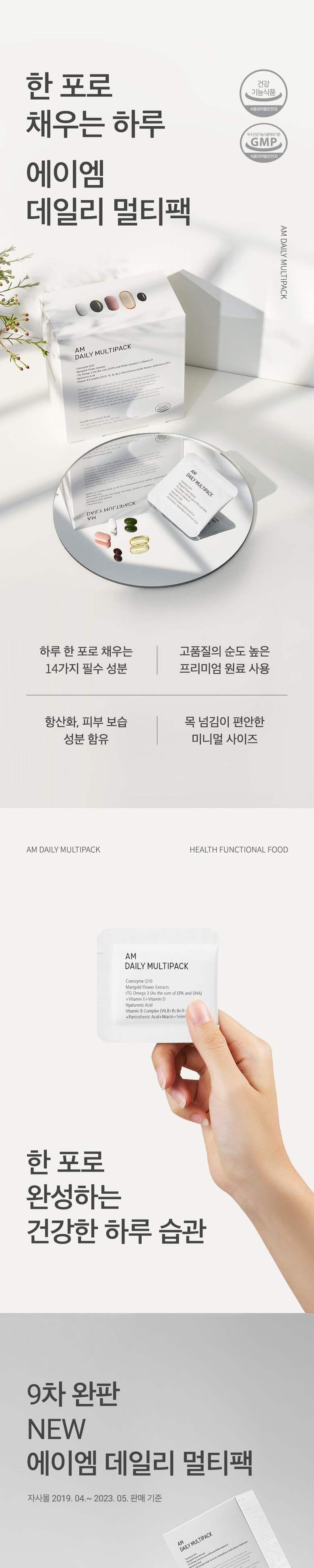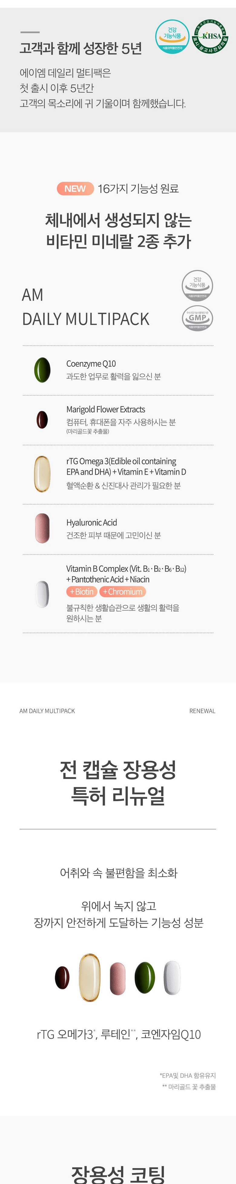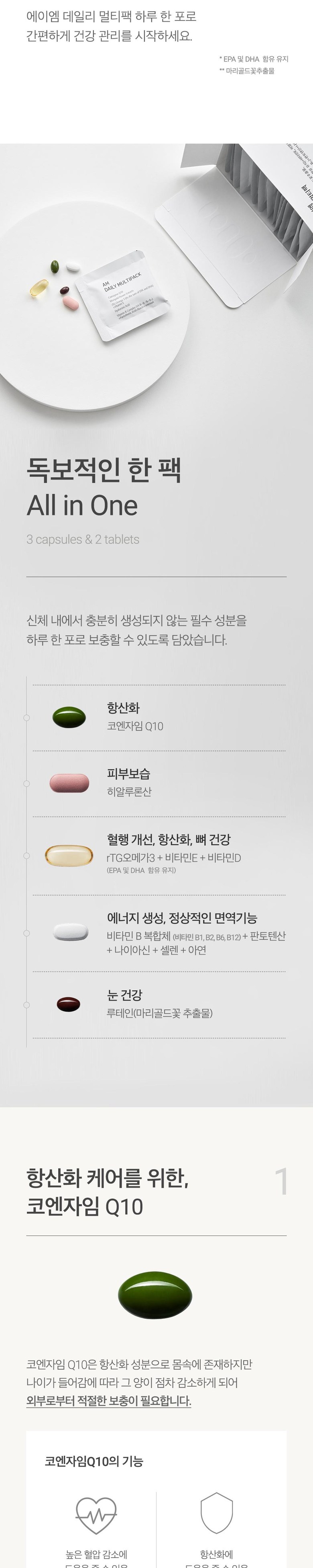 정품 에이엠 데일리 멀티팩 하루 한팩 종합 영양제, rTG오메가3, 코엔자임Q10, 히알루론산, 루테인, 비타민B 함유