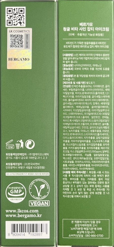 | 화장품제조업자, 화장품책임판매업자 및 맞춤형화장품판매업자 | (주)한국씨앤비 / (주)엘케이코스메틱 | 제조국 | 대한민국 |