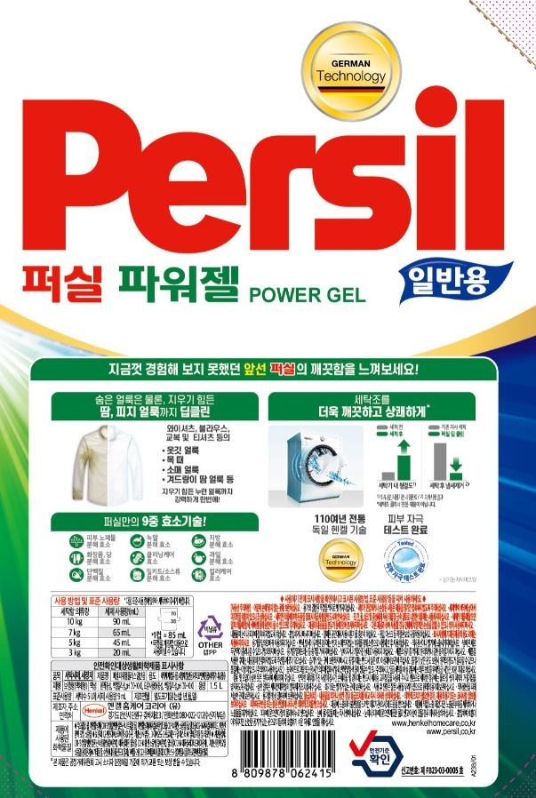 | 품목 및 제품명 | 세정제,세탁세제 / 퍼실 파워젤 플러스 일반용 | 용도(표백제의 경우 계열을 함께표시) 및 제형 | 일반용-기타표면세정용-세탁기내부용,섬유용 / 보충형-액체형 |