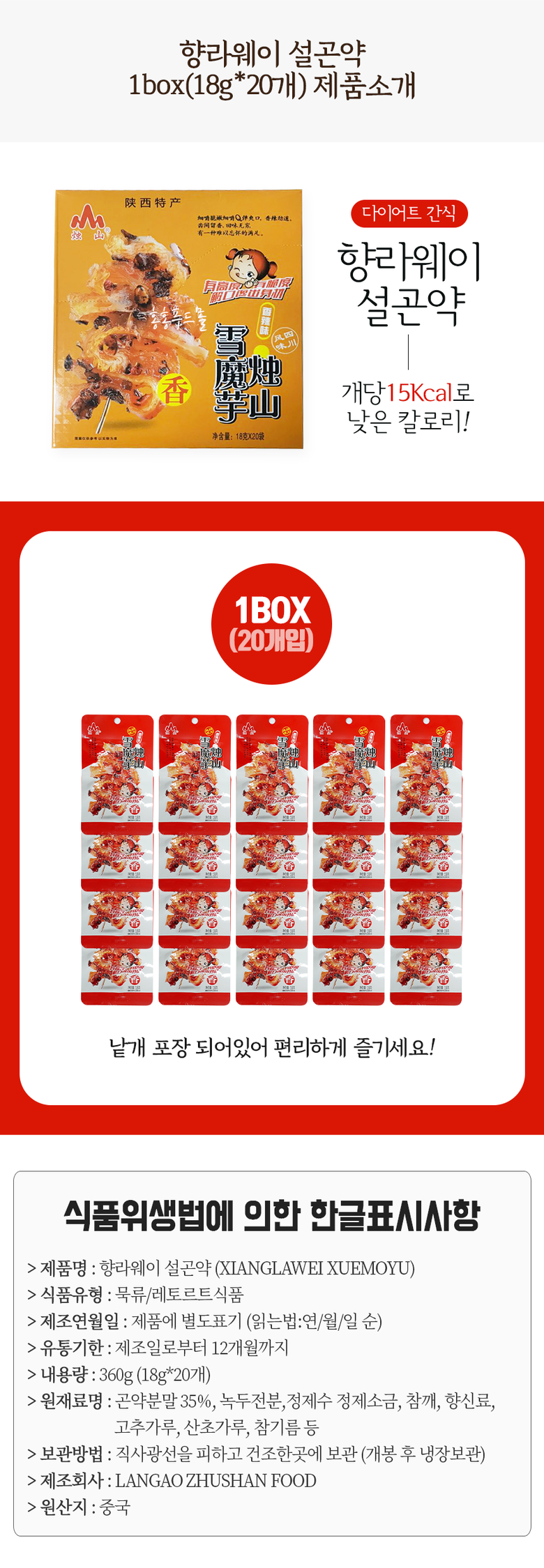 | 포장단위별 내용물의 용량(중량), 수량 | 360g (18g*20개) | 원재료명 및 함량 | 곤약분말 35%, 녹두전분,정제수 정제소금, 참깨, 향신료, 고추가루, 산초가루, 참기름 등 |