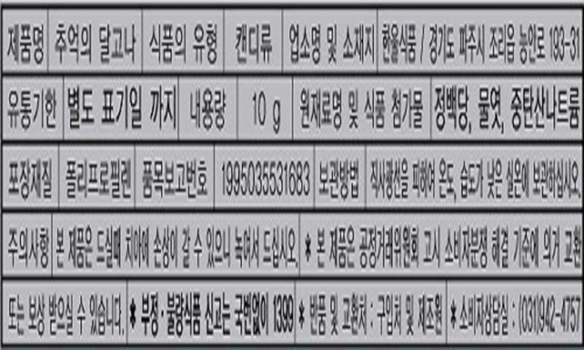 | 제품명 | 추억의 달고나 | 식품의 유형 | 캔디류 |