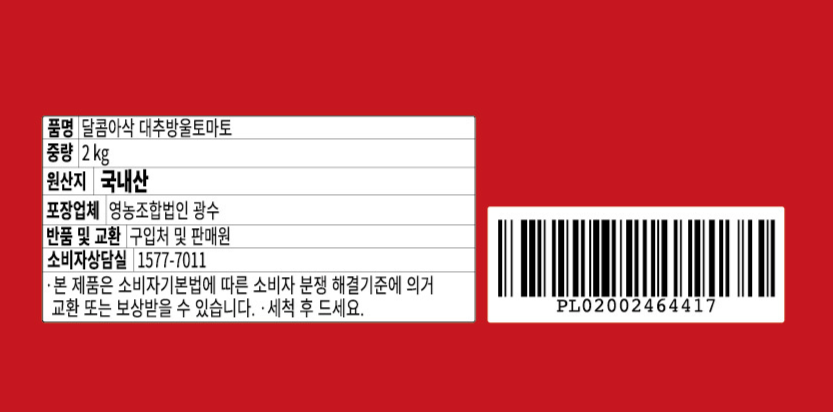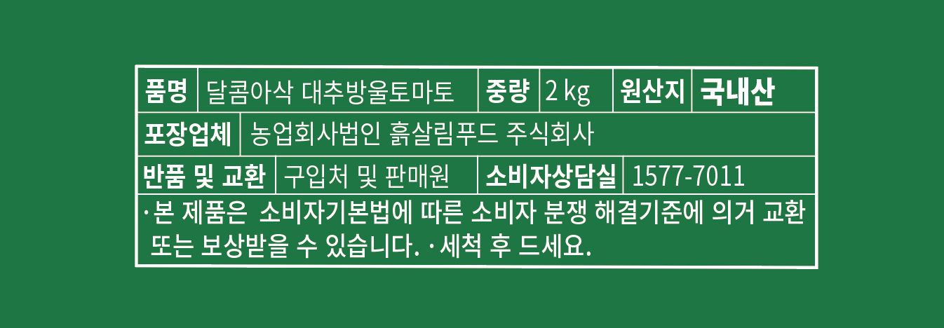 | 품목 또는 명칭 | 곰곰 달콤아삭 대추방울토마토 2kg 박스 | 포장단위별 내용물의 용량(중량),수량,크기 | 2kg x 2개 |