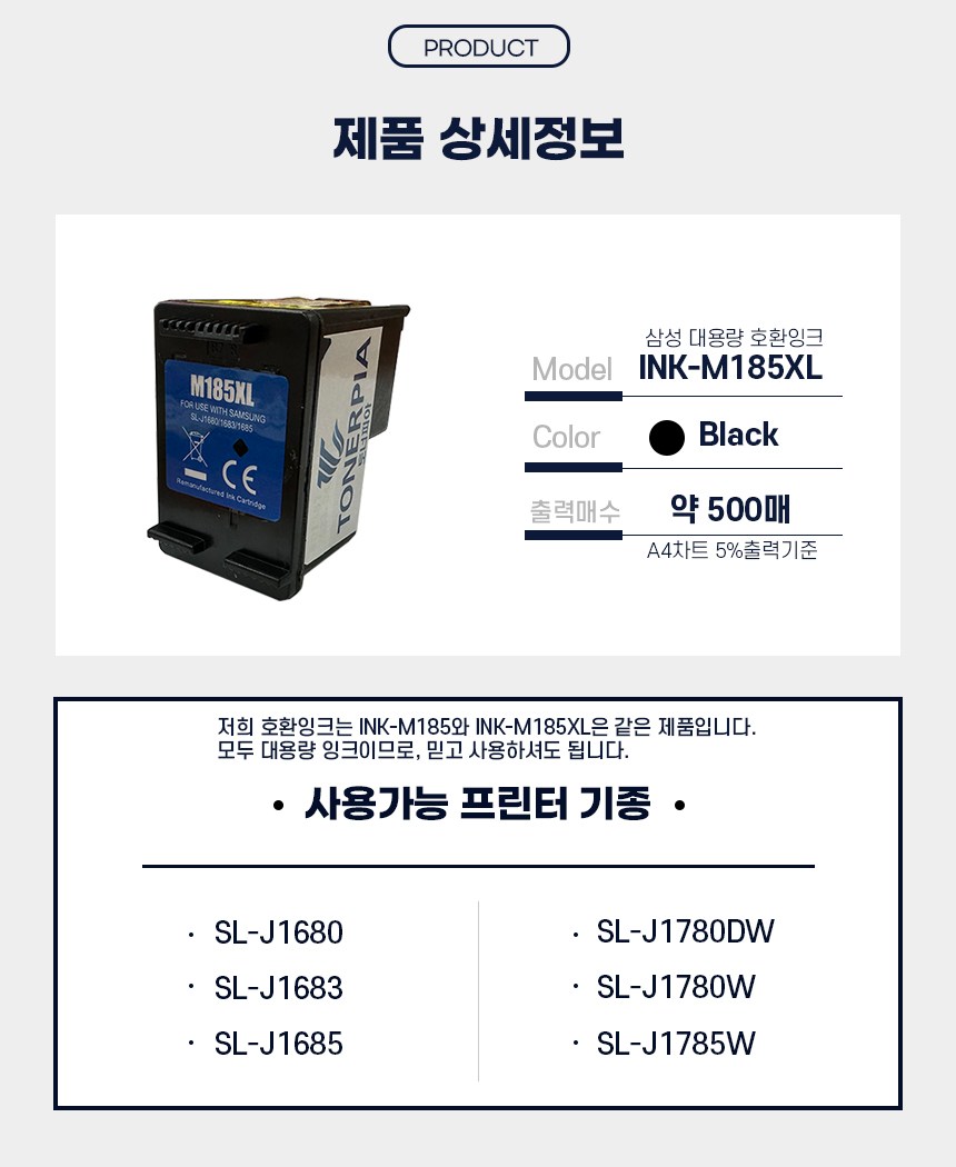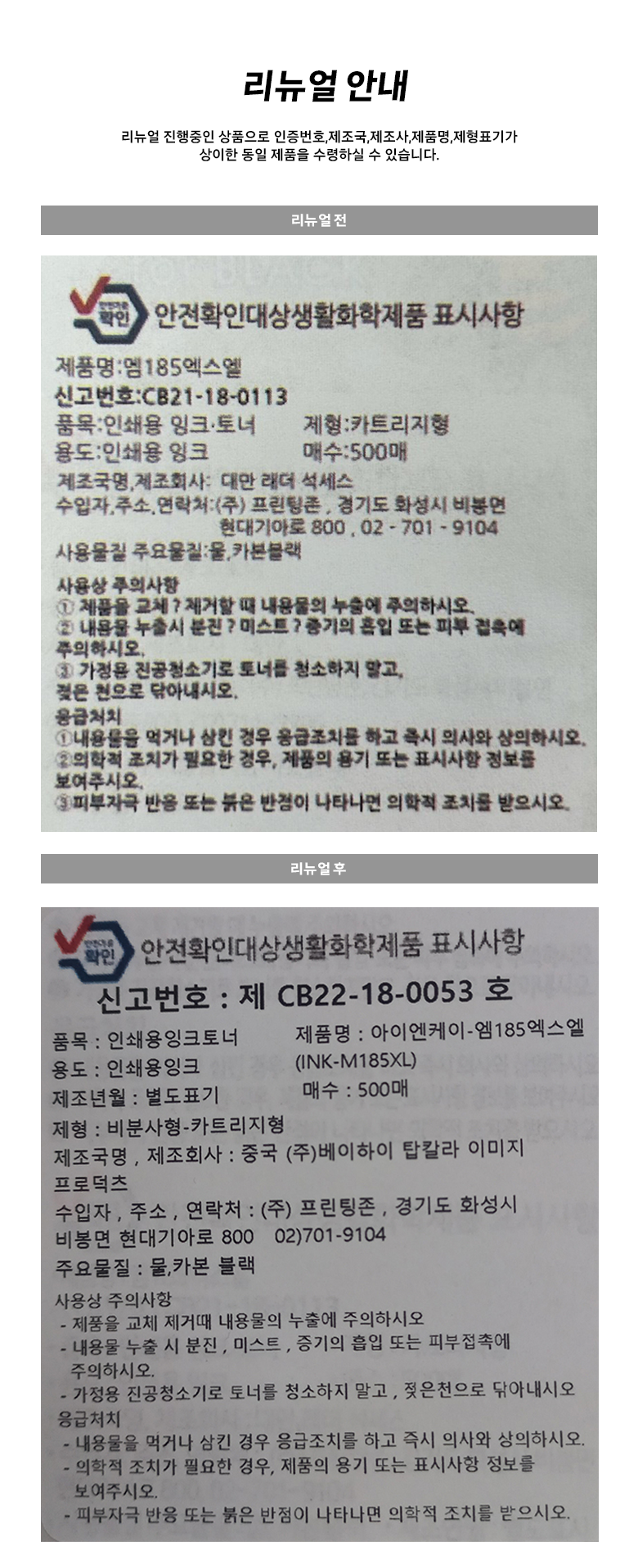 | 품목 및 제품명 | 리뉴얼 전: 인쇄용 잉크·토너/ 엠185엑스엘 리뉴얼후: 인쇄용 잉크·토너 / 아이엔케이-엠185엑스엘 (INK-M185XL) | 용도(표백제의 경우 계열을 함께표시) 및 제형 | 인쇄용 잉크/ 카트리지형 |