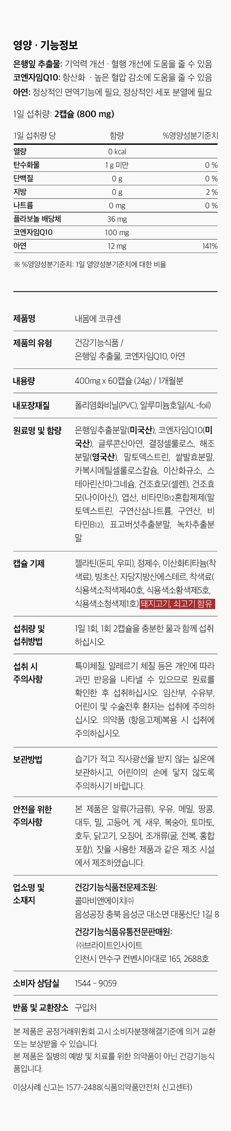 | 원료명 및 함량 | 상품 상세페이지 참조 | 영양정보 | 상품 상세페이지 참조 |