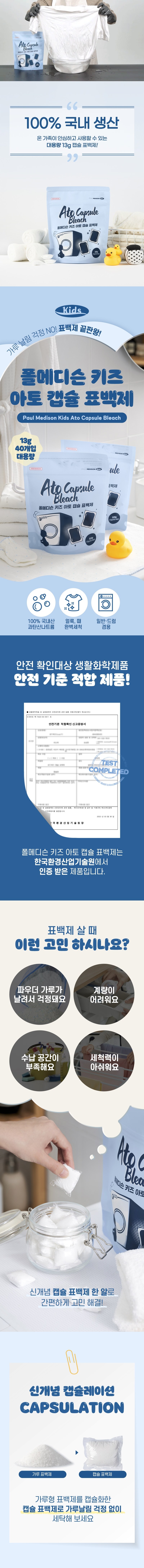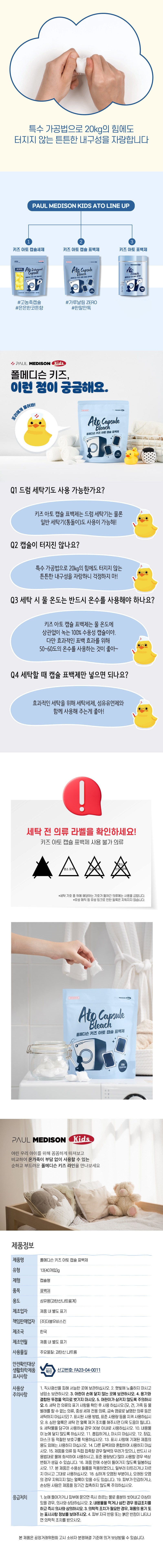 | 품목 및 제품명 | 표백제 / 폴메디슨 키즈 아토 캡슐 표백제 | 용도(표백제의 경우 계열을 함께표시) 및 제형 | 섬유용(과탄산나트륨계) / 캡슐형 |