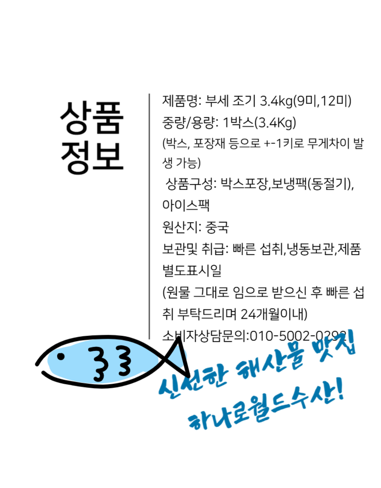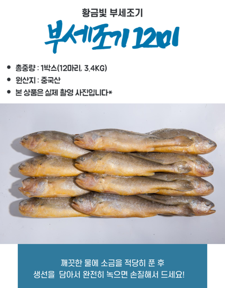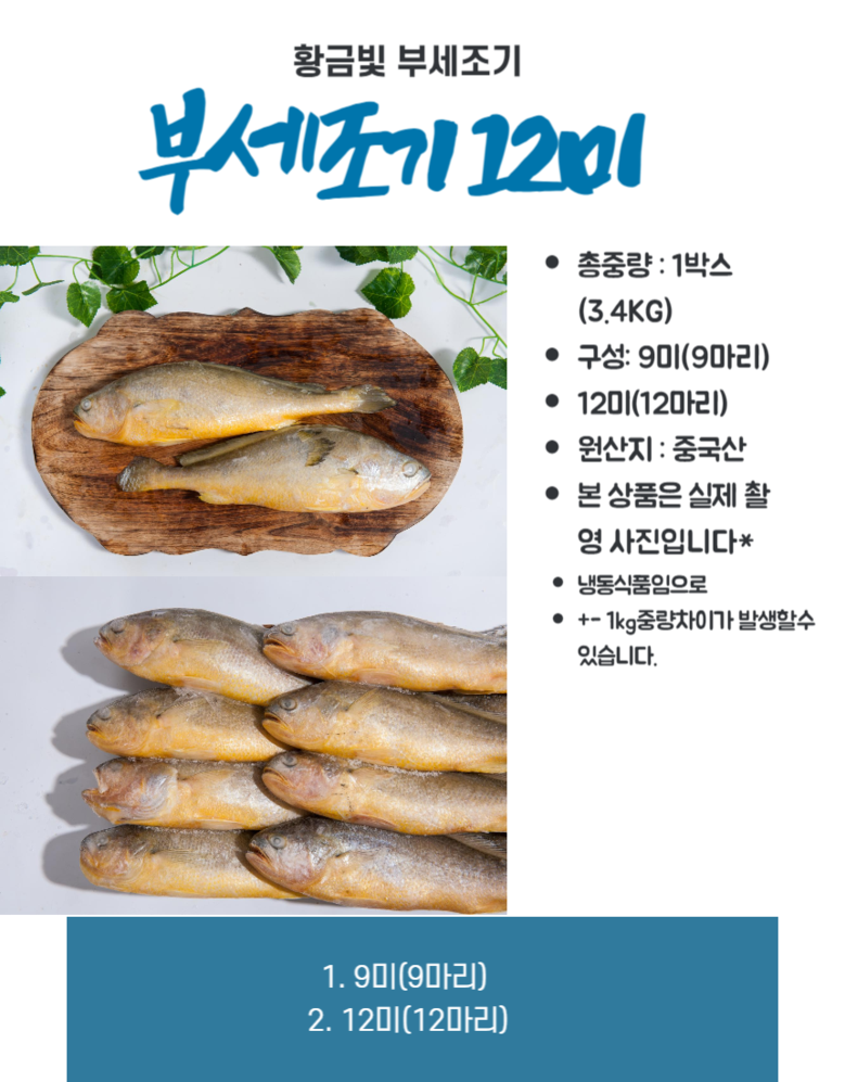 | 품목 또는 명칭 | 부세조기3.4kg 12미 | 포장단위별 내용물의 용량(중량),수량,크기 | 3.4kg 12마리=1박스 |