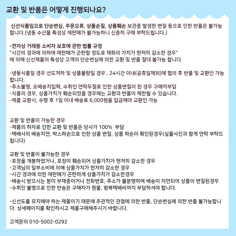 - ㆍ교환/반품에 관한 일반적인 사항은 판매자가 제시사항보다 관계법령이 우선합니다.