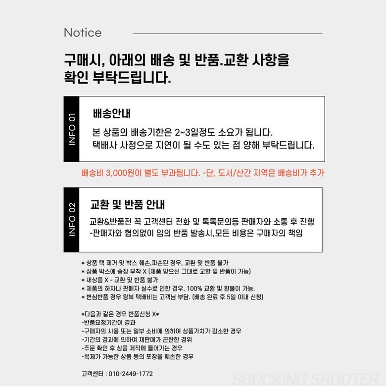 - ㆍ교환/반품에 관한 일반적인 사항은 판매자가 제시사항보다 관계법령이 우선합니다.