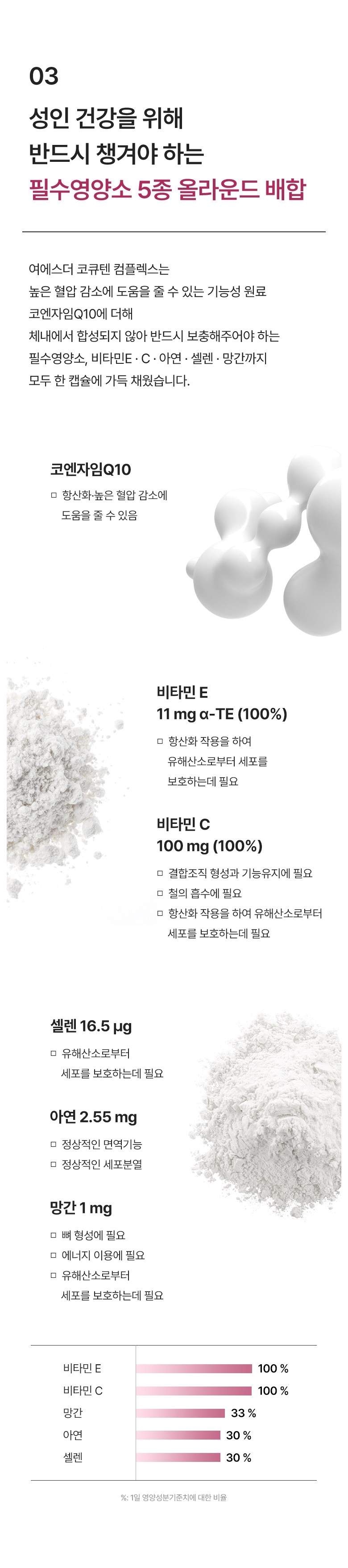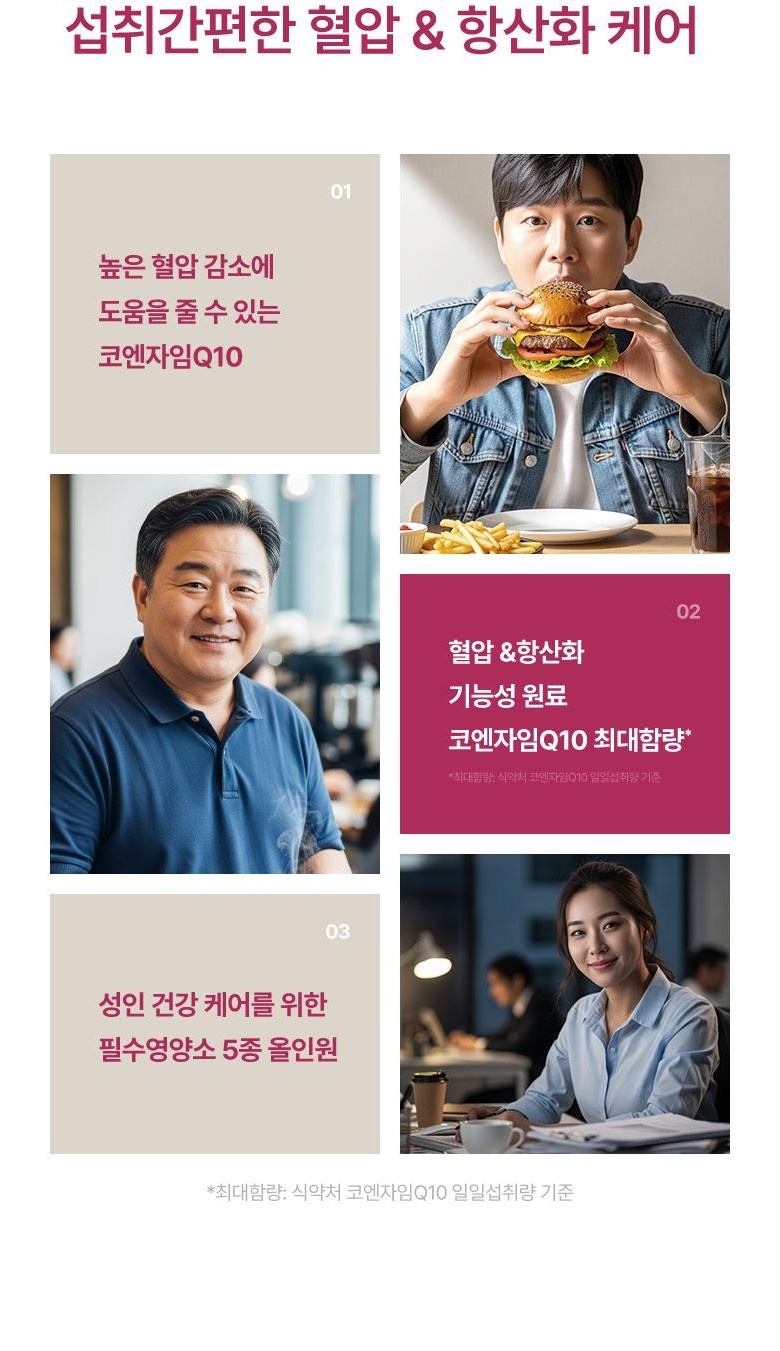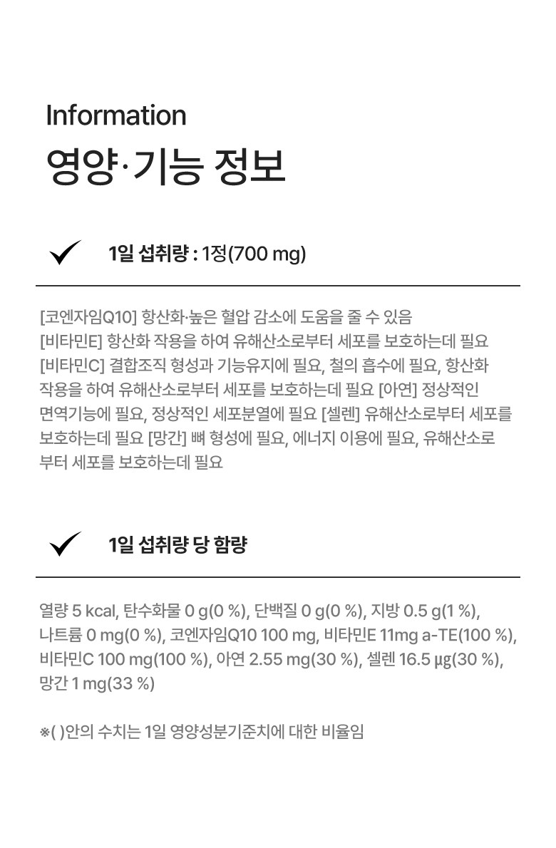 | 원료명 및 함량 | 비타민C, 코엔자임Q10, d-α-토코페롤, 황산망간, 산화아연, 아셀렌산나트륨혼합제제(아셀렌산나트륨, 제이인산칼슘), 콩기름(대두유), 밀납, 레시틴, 건조효모, 비타민K2, 엽산, 비타민B6염산염, 비타민B12혼합제제분말(덱스트린, 구연산삼나트륨, 구연산, 비타민B12) [캡슐기제] 히드록시프로필전분, 글리세린, 카라기난, 폴리글리시톨액, 카카오색소 *알레르기 주의물질: 대두 함유 | 영양정보 | 상품 상세페이지 참조 |