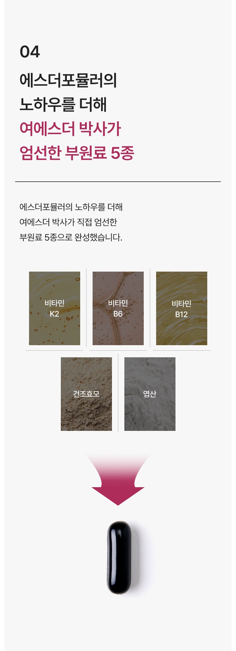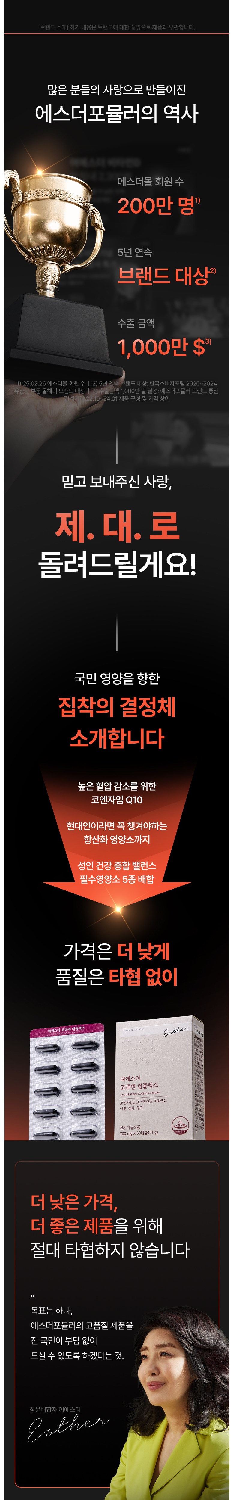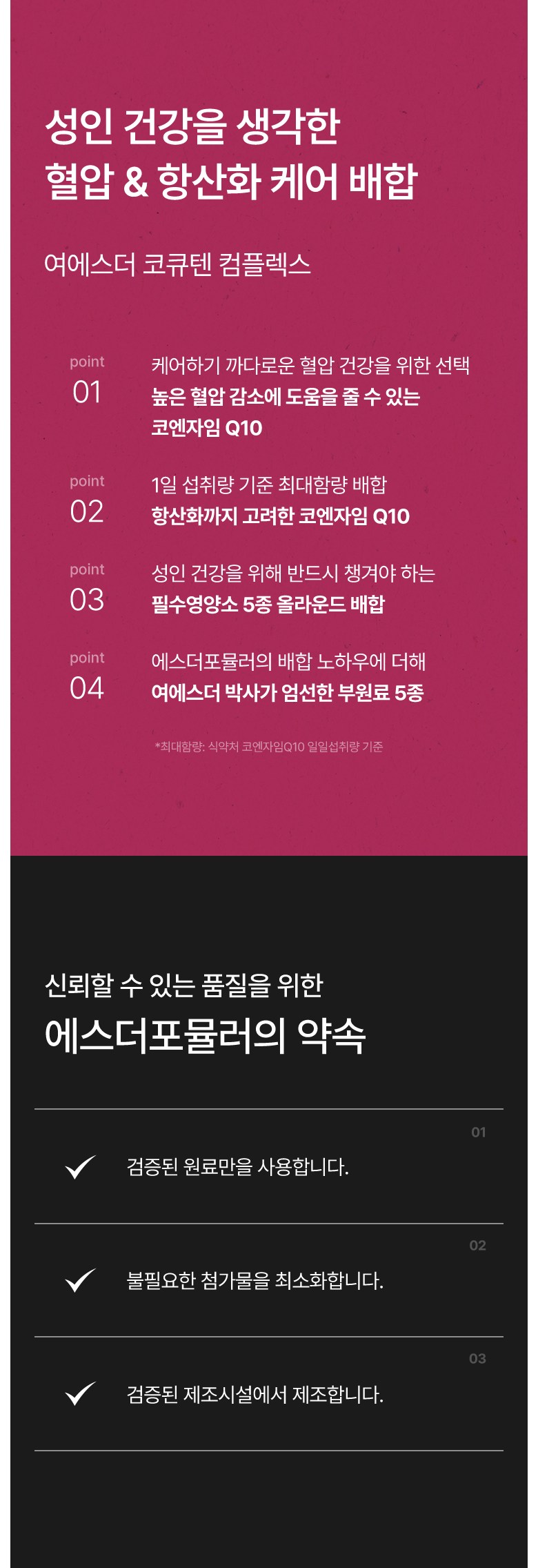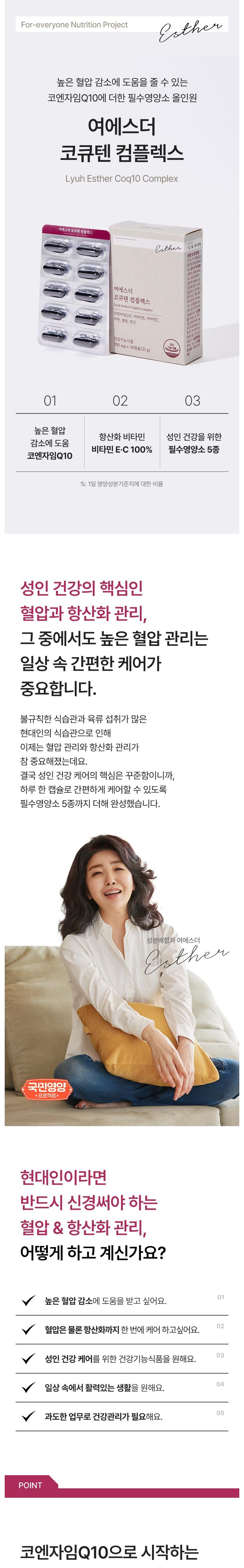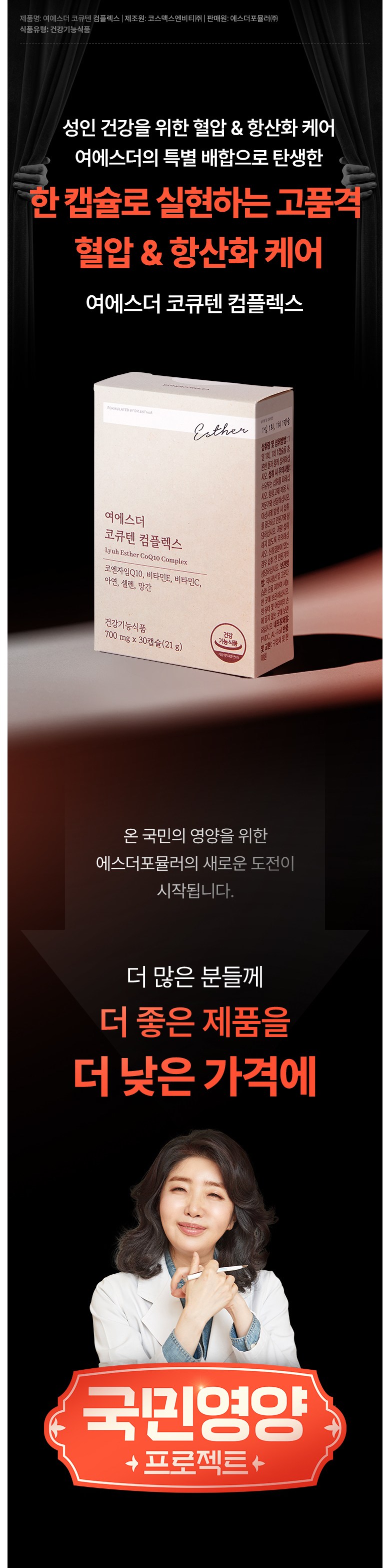 | 제품명 | 여에스더 코큐텐 컴플렉스 (건강기능식품에 관한 법률에 따른 심의 필함 / 250810568) | 제조업소의 명칭과 소재지 | 코스맥스엔비티㈜ / 경기도 이천시 마장면 덕평로663번길 127-16 |