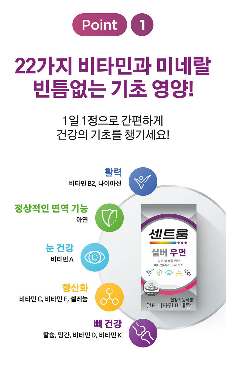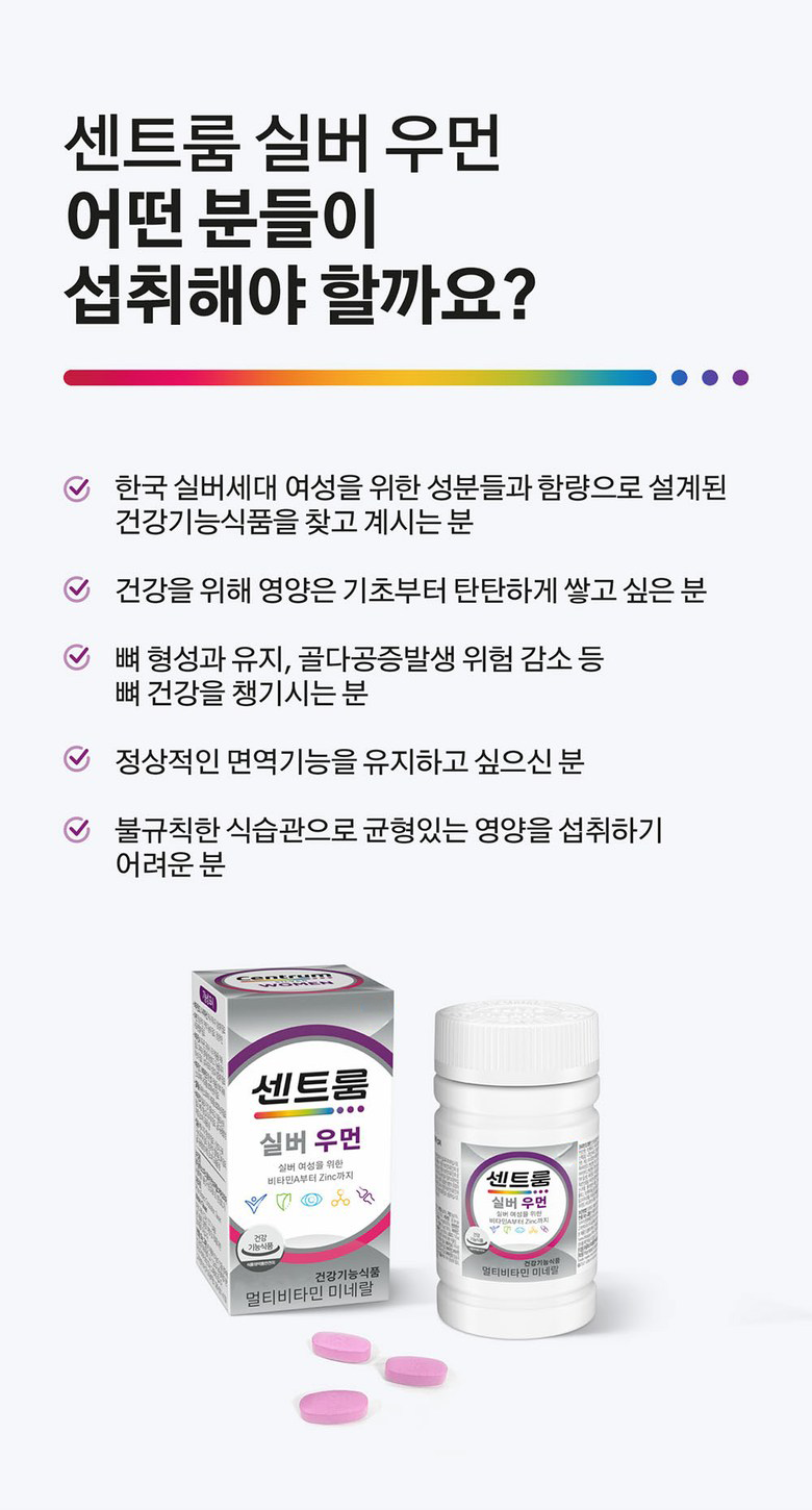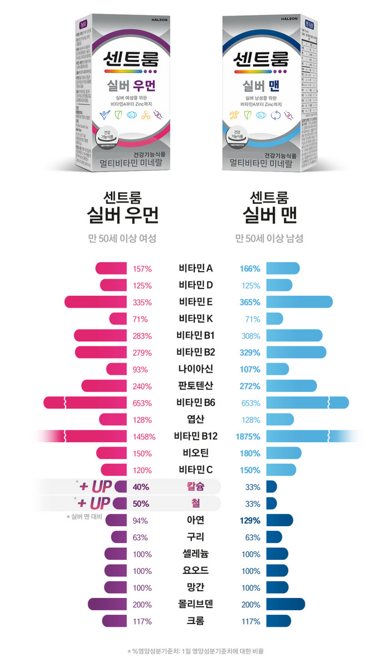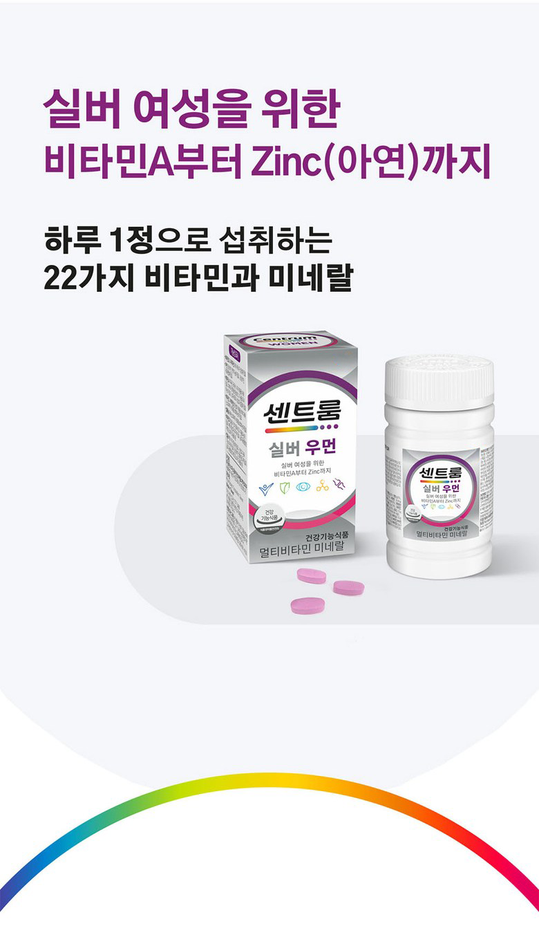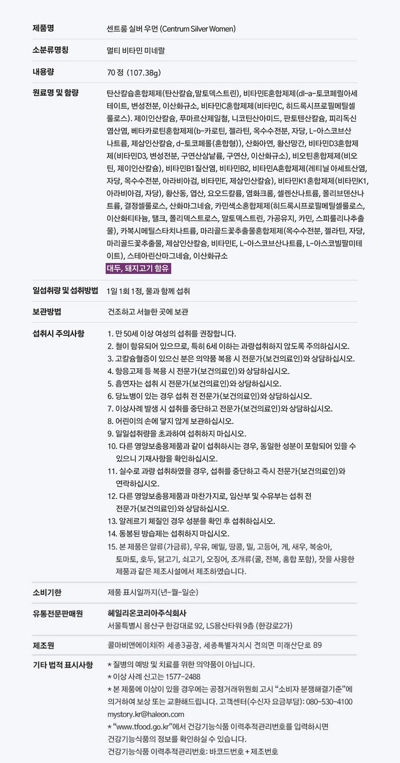 | 제품명 | 센트룸 실버 우먼 | 제조업소의 명칭과 소재지 | 제조원: 콜마비앤에이치(주) 세종3공장, 세종특별자치시 전의면 미래산단로 89 유통전문 판매원: 헤일리온코리아주식회사 서울특별시 용산구 한강대로 92, LS용산타워9층 (한강로2가) |