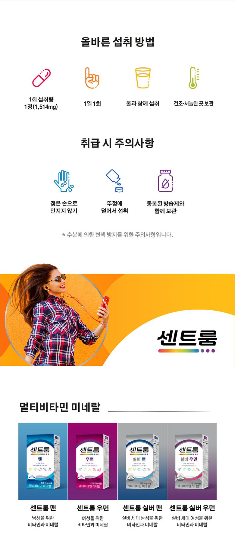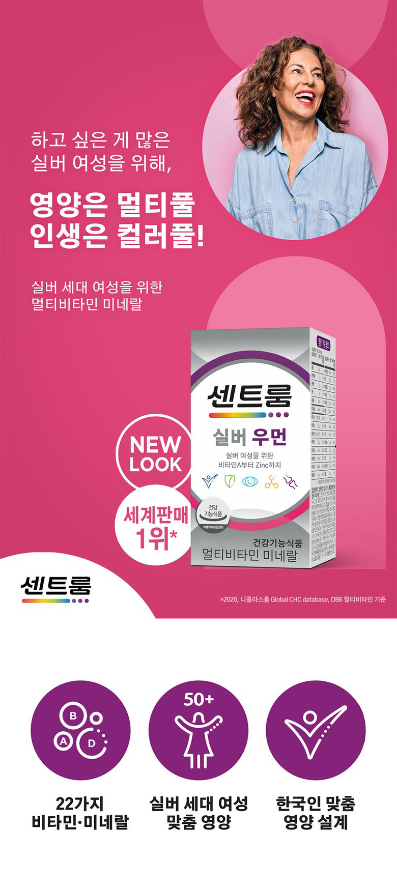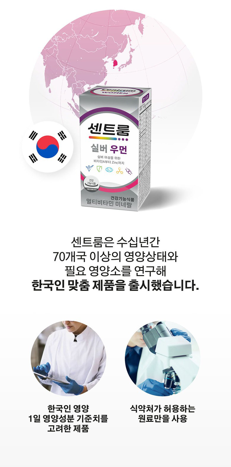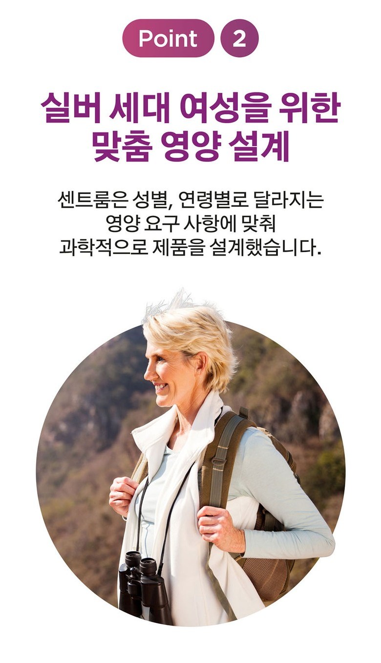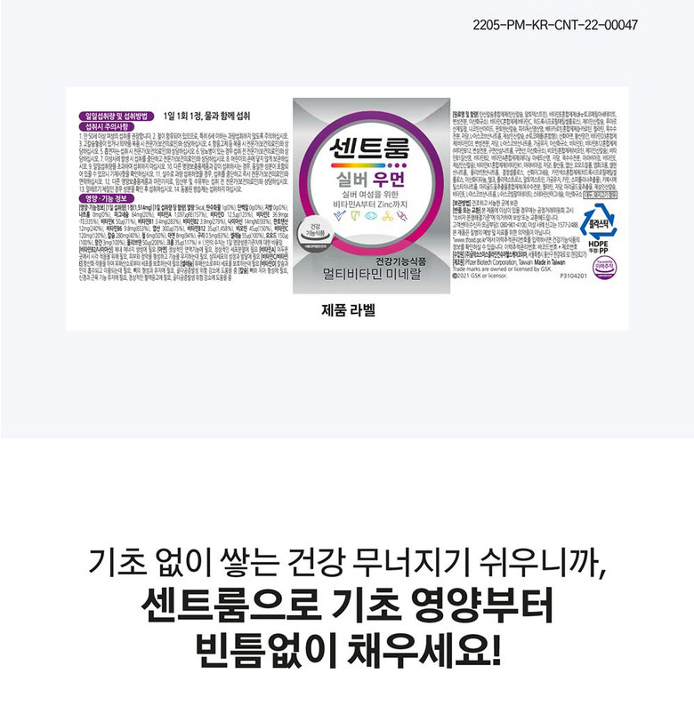 | 제품명 | 센트룸 실버 우먼 | 제조업소의 명칭과 소재지 | 제조원: 콜마비앤에이치(주) 세종3공장, 세종특별자치시 전의면 미래산단로 89 유통전문 판매원: 헤일리온코리아주식회사 서울특별시 용산구 한강대로 92, LS용산타워9층 (한강로2가) |