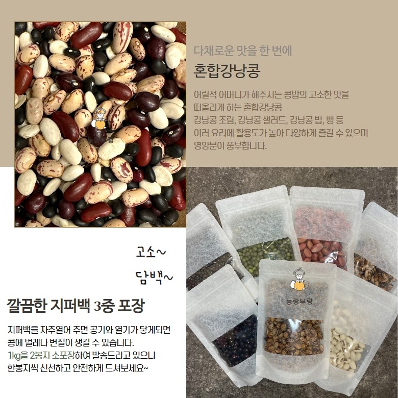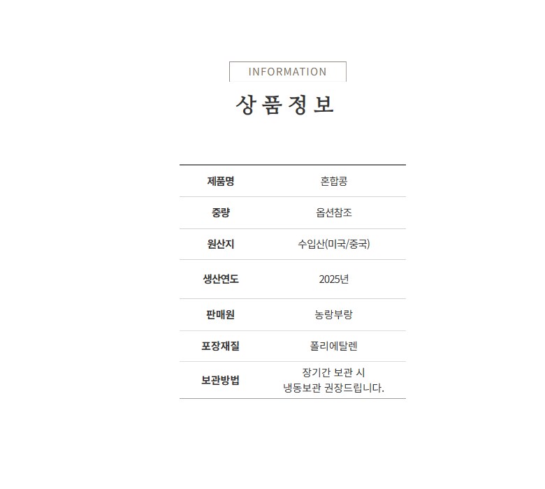 | 품목 또는 명칭 | 혼합콩 | 포장단위별 내용물의 용량(중량),수량,크기 | 2kg |