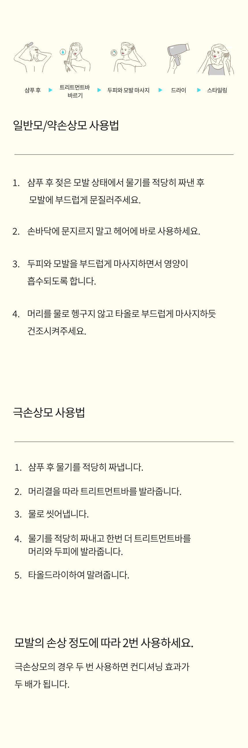 | 사용기한 또는 개봉 후 사용기간 | 본 상품은 해당 물류센터 직발송 상품인 관계로 제조연월일 및 사용기한 정보가 매번 변경되므로 상단 사용기한 정보를 참고해 주세요. | 사용방법 | 샴푸 후 젖은 모발상태에서 모발에 부드럽게 문질러주세요. 머리를 헹구지 않고 타올로 부드럽게 건조시켜주세요. |