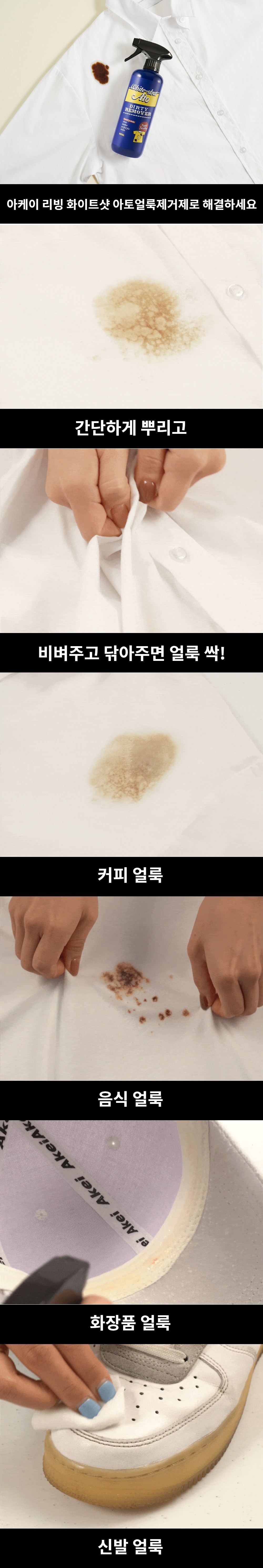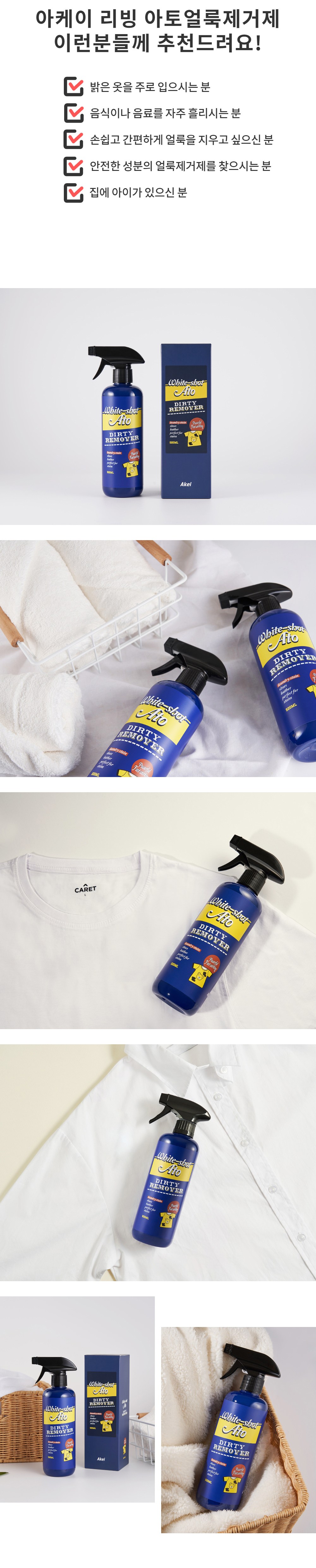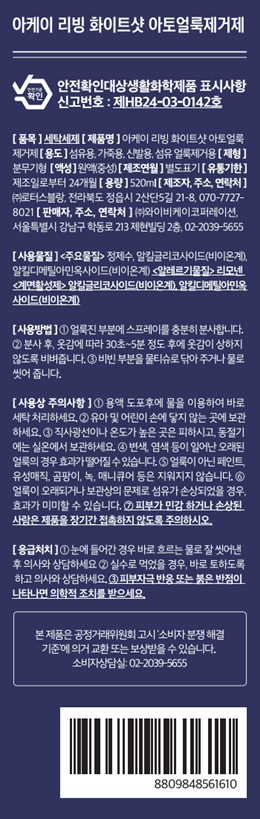 | 품목 및 제품명 | 세탁세제/아케이 리빙 화이트샷 아토얼룩제거제 | 용도(표백제의 경우 계열을 함께표시) 및 제형 | 섬유 얼룩제거용,섬유용,가죽용,신발용/분사형-분무기형 |