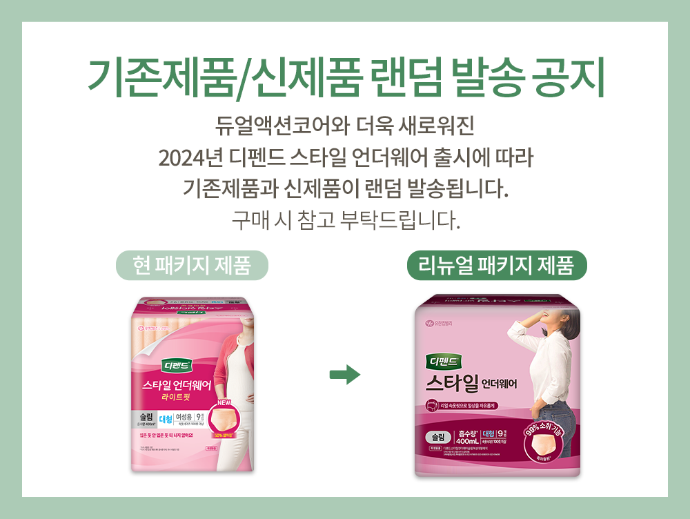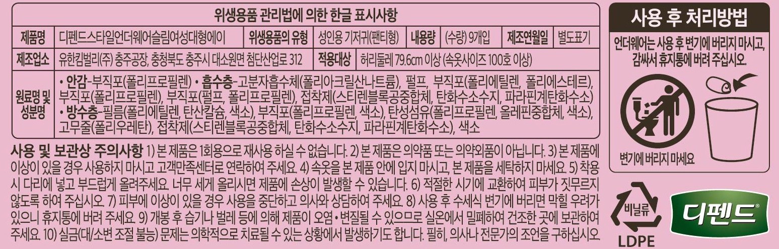 | 품명 및 모델명 | 디펜드 스타일 언더웨어 슬림 여성 대형 에이 | 인증/허가 사항 | 위생용품 |