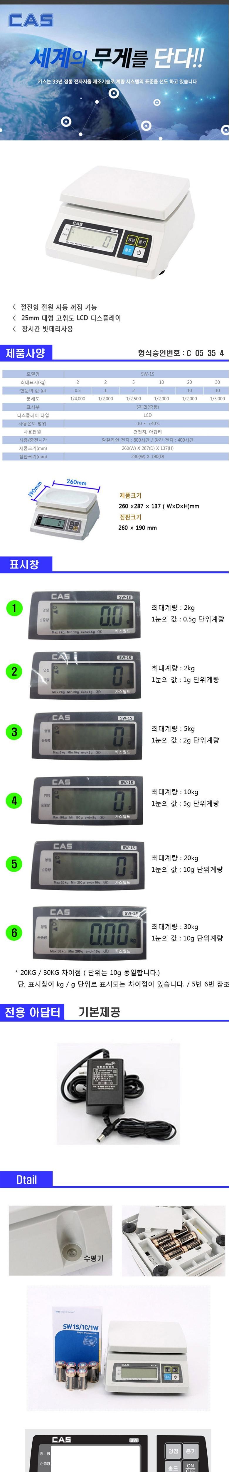 카스 CAS 전자 저울 주방 업소용 SW-1S 2KG 5KG 10KG 20KG 30KG / 구입전 최대 계량 확인, SW-1S(최대30..., 1개