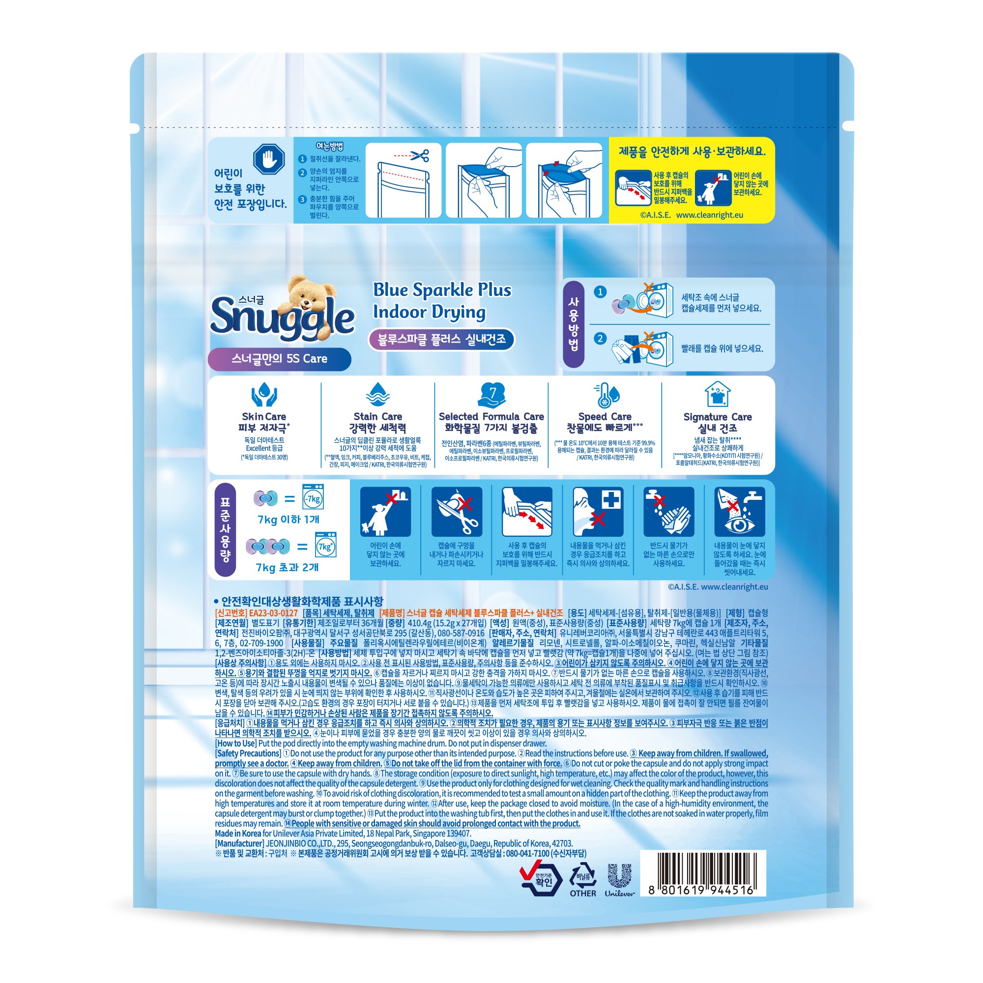 | 품목 및 제품명 | 탈취제, 세탁세제 / 스너글 캡슐 세탁세제 블루스파클 플러스+ 실내건조 | 용도(표백제의 경우 계열을 함께표시) 및 제형 | 세탁세제-[섬유용], 탈취제-[일반용(물체용)]/캡슐형 |