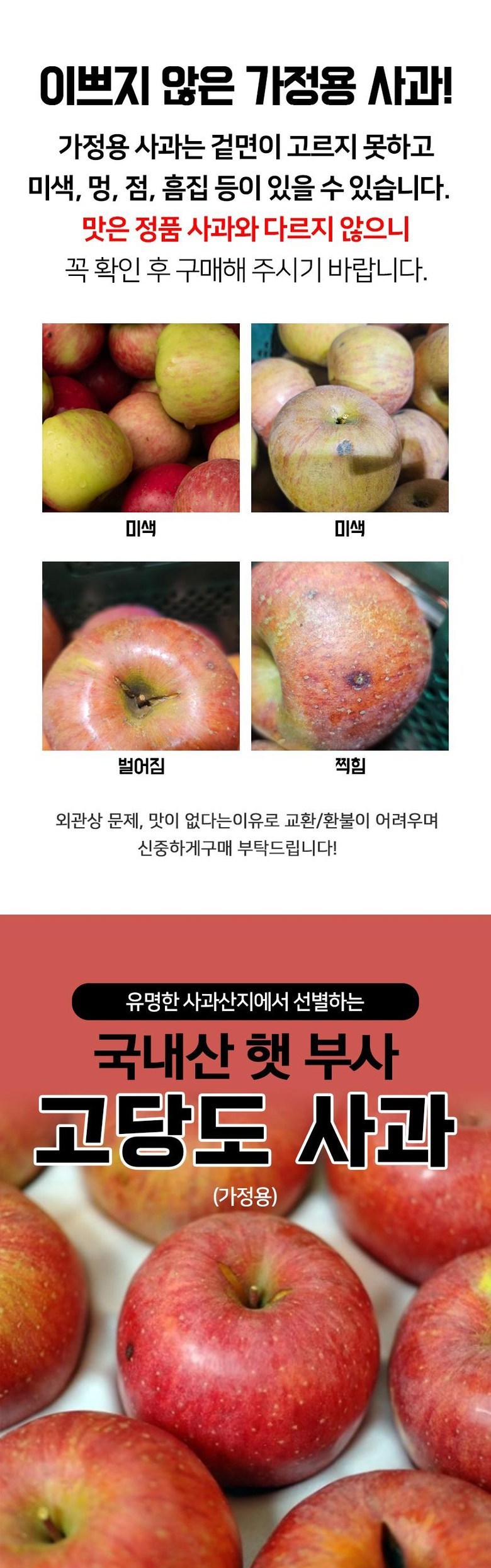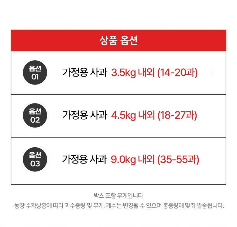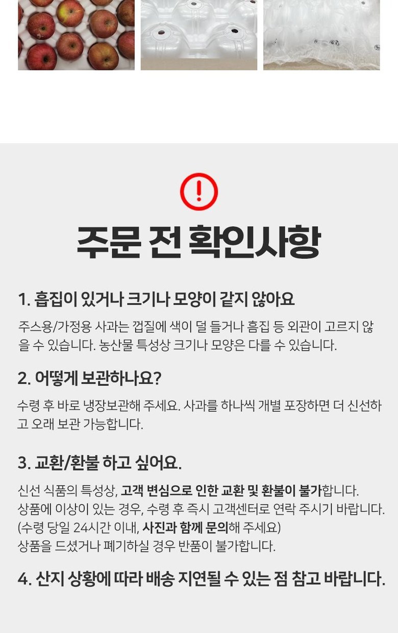 | 품목 또는 명칭 | 가정용 사과 | 포장단위별 내용물의 용량(중량),수량,크기 | 상품 상세페이지 참조 |