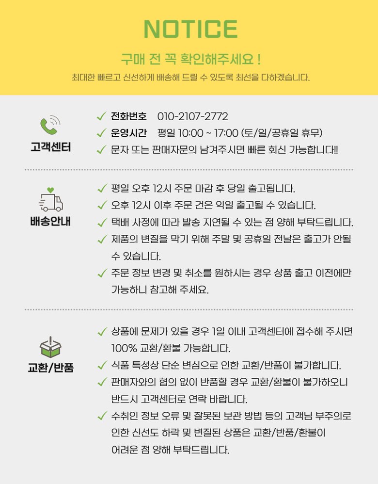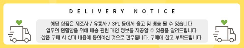 | 배송기간 | ㆍ도서산간 지역 등은 배송에 3-5일이 더 소요될 수 있습니다. - 천재지변, 물량 수급 변동 등 예외적인 사유 발생 시, 다소 지연될 수 있는 점 양해 부탁드립니다. | ||
