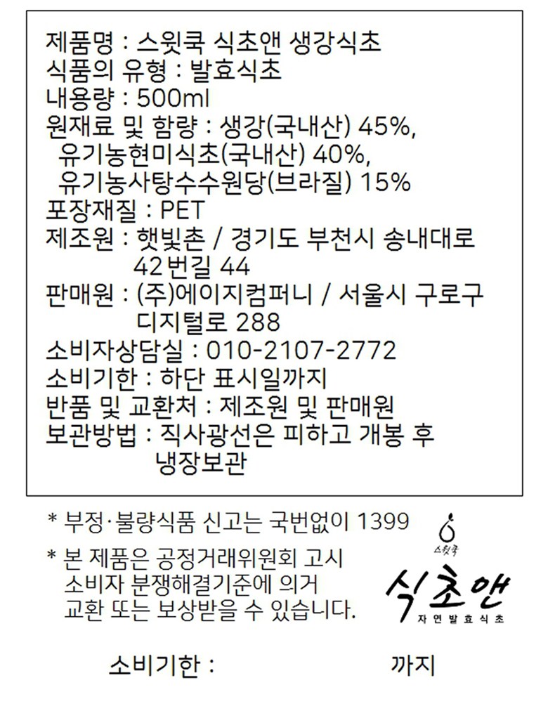 | 제품명 | 스윗쿡 식초앤 | 식품의 유형 | 마시는 식초 |
