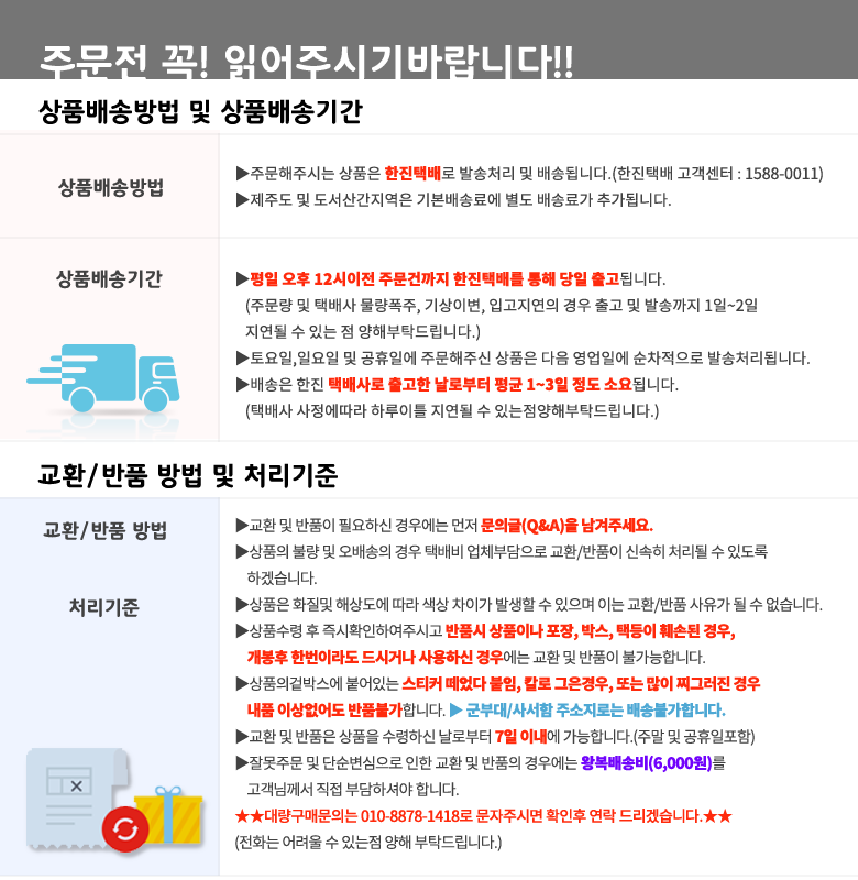 - ㆍ교환/반품에 관한 일반적인 사항은 판매자가 제시사항보다 관계법령이 우선합니다.