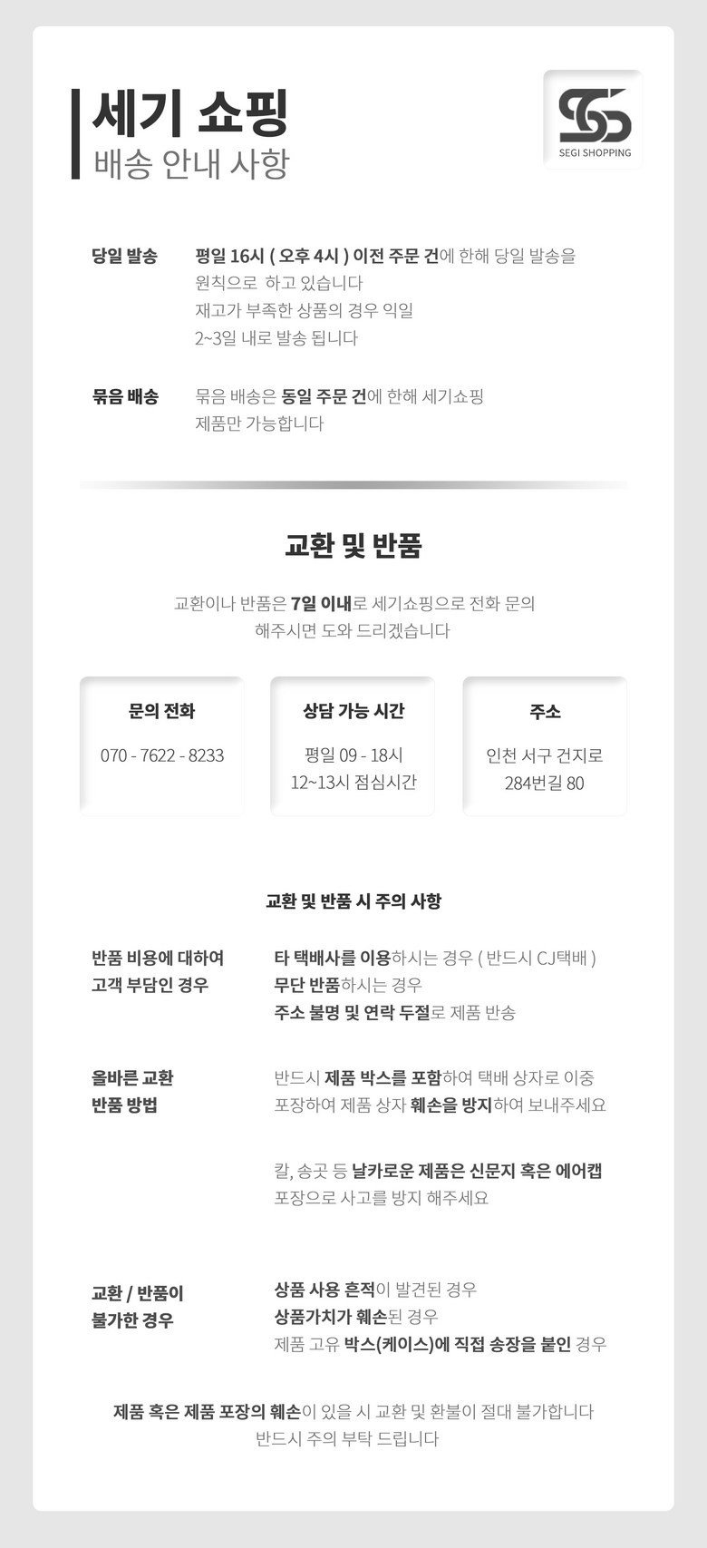 - ㆍ교환/반품에 관한 일반적인 사항은 판매자가 제시사항보다 관계법령이 우선합니다.