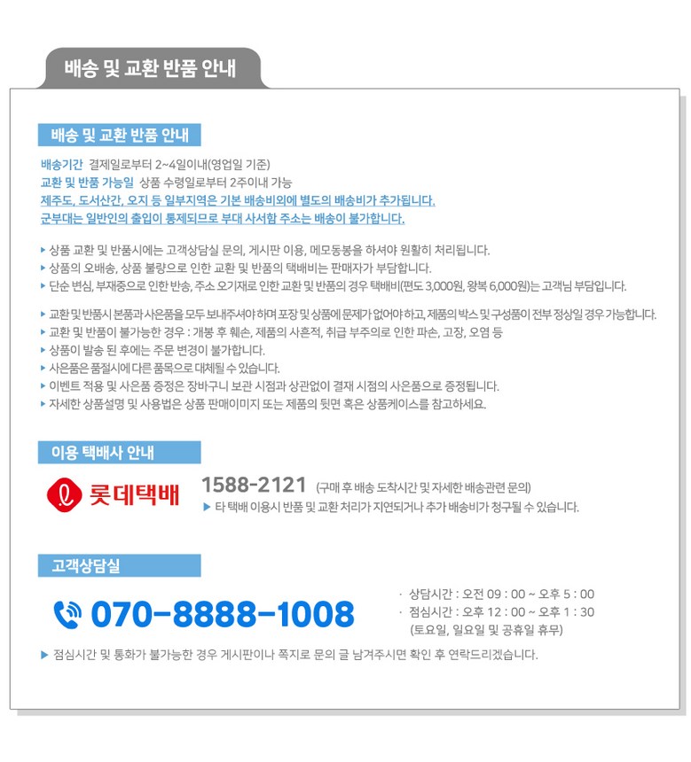 - ㆍ교환/반품에 관한 일반적인 사항은 판매자가 제시사항보다 관계법령이 우선합니다.