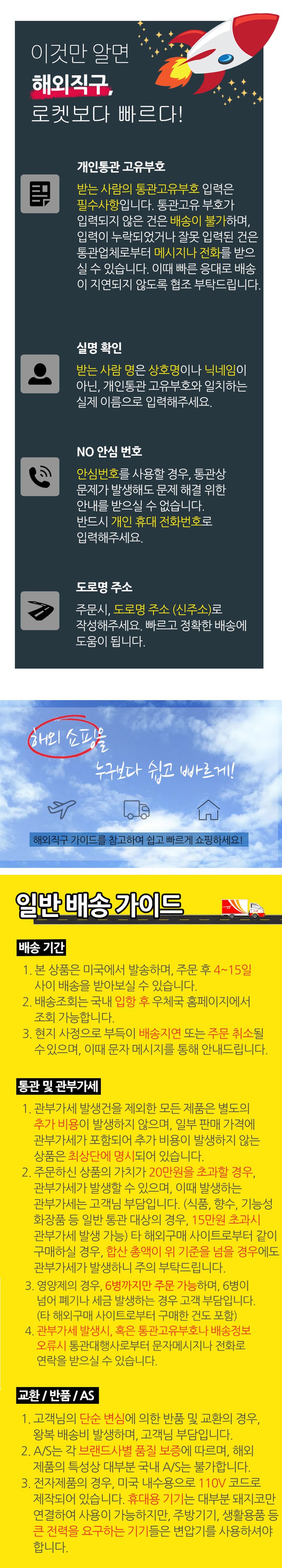 | 배송방법 | 해외직구 | 배송비 | 15,000원 · 도서산간 추가 배송비 - 제주 지역: 3,000원 - 도서산간 지역: 3,000원 |