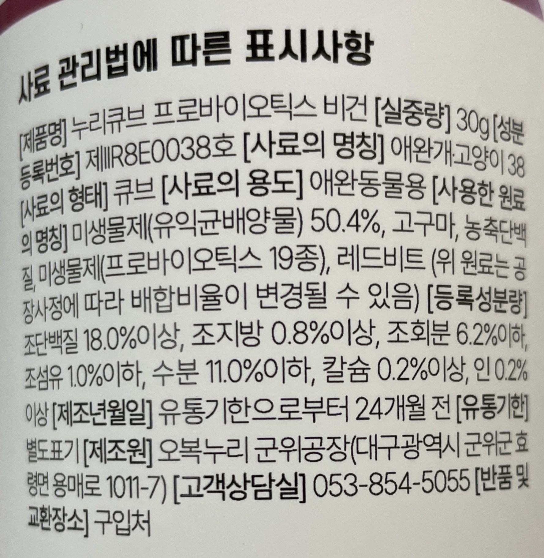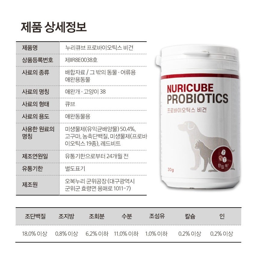 | 품명 및 모델명 | 누리큐브 프로바이오틱스 비건 | 인증/허가 사항 | 사료관리법에 따른 성분등록번호 : 컨텐츠 참조 |
