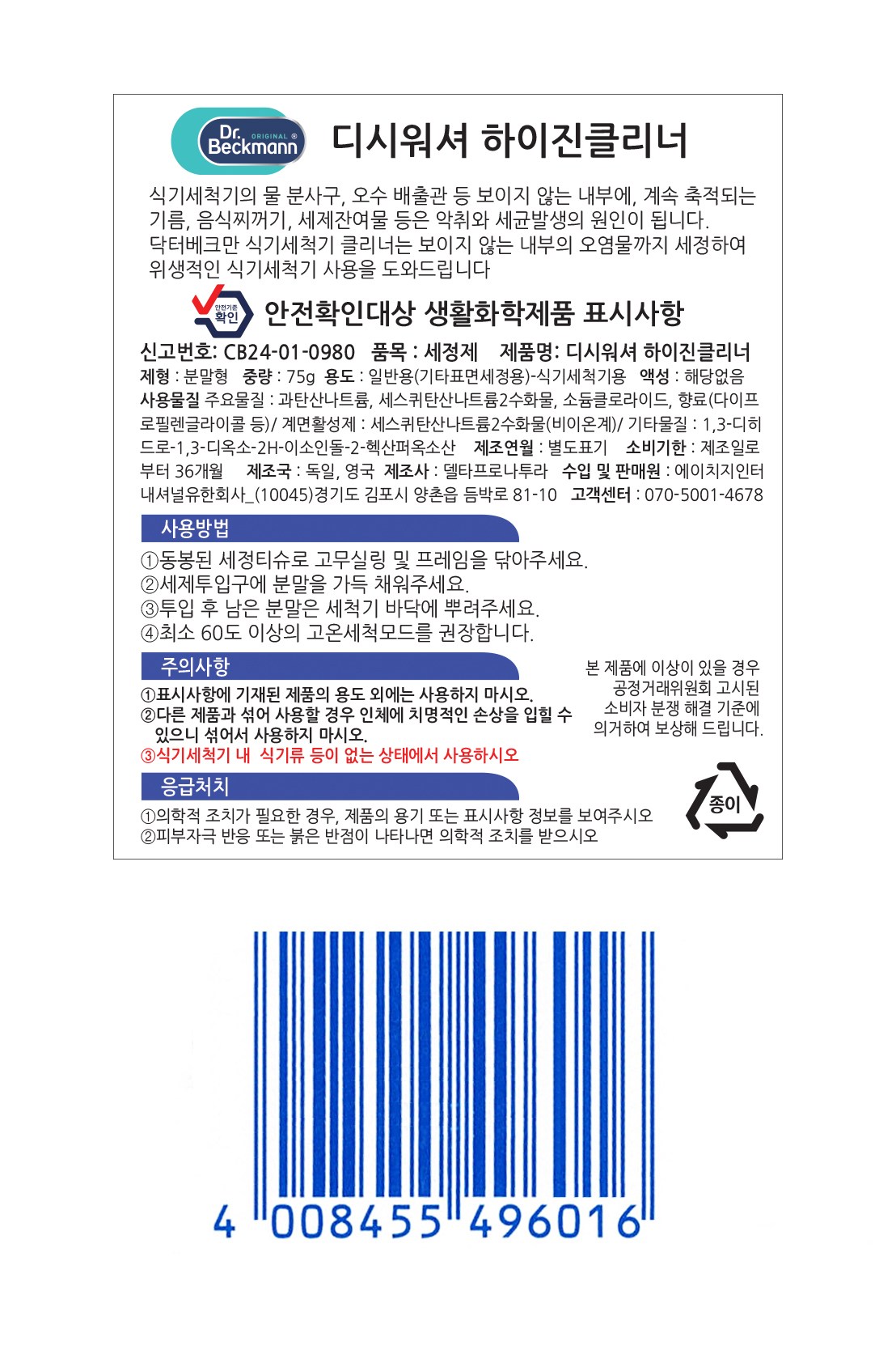 | 품목 및 제품명 | 세정제 / 디시워셔 하이진클리너 | 용도(표백제의 경우 계열을 함께표시) 및 제형 | 일반용(기타표면세정용)-식기세척기용 / 분말형 |