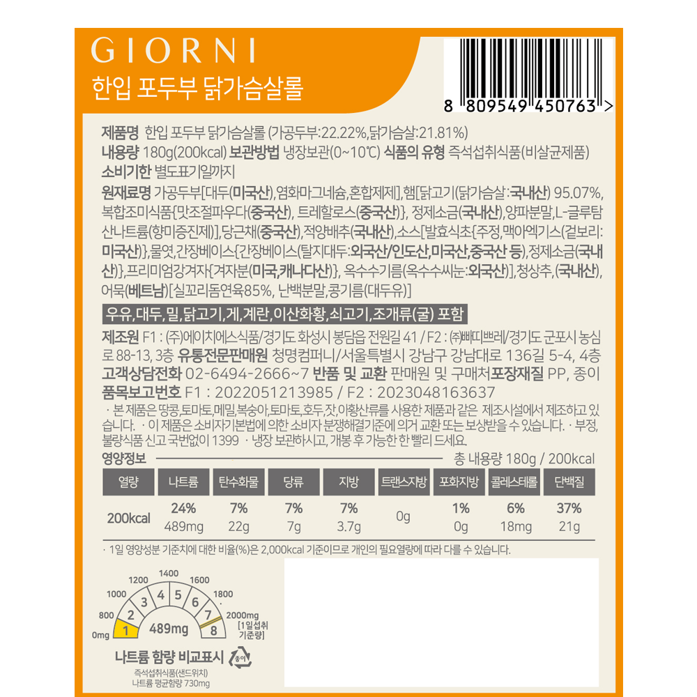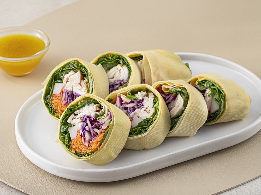 먹기 좋은 크기로 슬라이스 되어 간편한 포두부 닭가슴살롤이에요. 쫄깃한 포두부에 다채로운 재료를 감싸 만들었지요. 고소한 훈제 치킨 닭가슴살과 아삭한 적채, 당근을 품어 풍성하답니다. 달짝지근하고 향긋한 겨자드레싱이 동봉되어 있어, 취향에 맞게 더해드실 수 있어요.