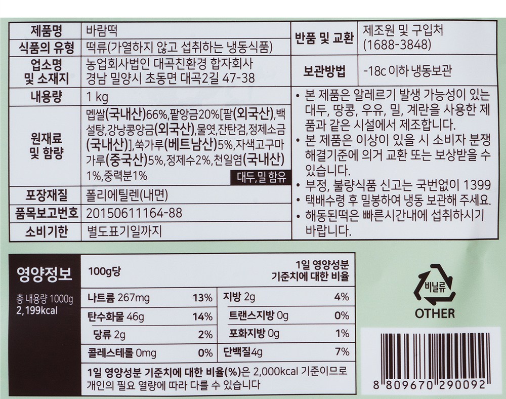 | 포장단위별 내용물의 용량(중량), 수량 | 1kg x 2개 | 원재료명 및 함량 | 컨텐츠 참조 |