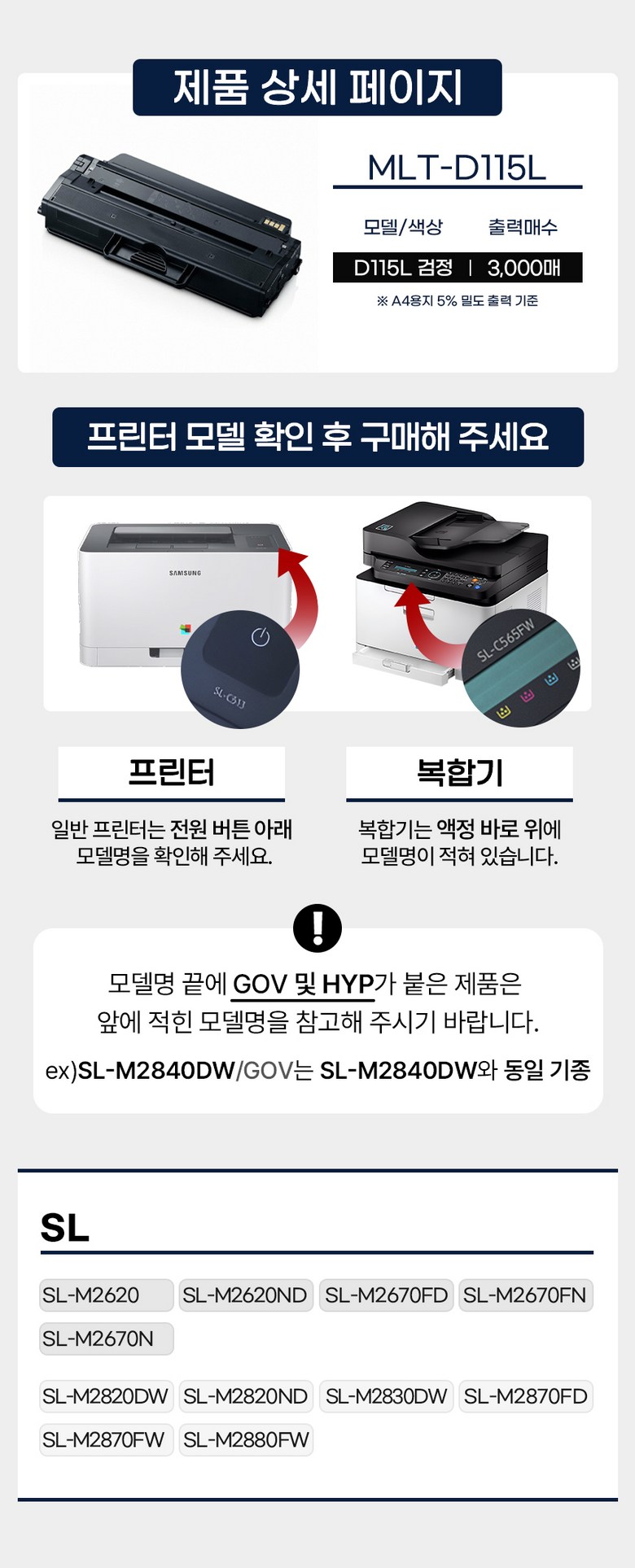 | 품목 및 제품명 | 엠엘티-디115엘 (MLT-D115L) | 용도(표백제의 경우 계열을 함께표시) 및 제형 | 인쇄용 토너 |