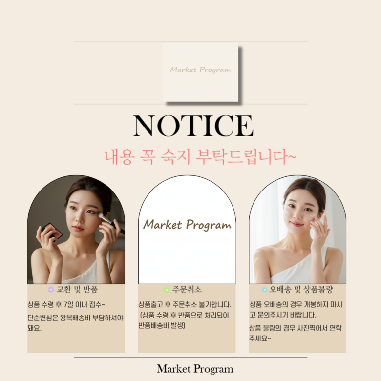 - ㆍ모니터 해상도의 차이로 인해 색상이나 이미지가 실제와 달라, 고객이 단순 변심으로 교환/반품을 무료로 요청하는 경우