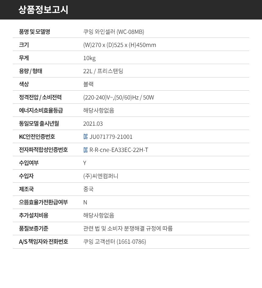 | 품명 및 모델명 | 전기냉장냉동기기(와인셀러) / WC-08MB | KC 인증정보 | JU071779-21001, R-R-cne-EA33EC-22H-T |