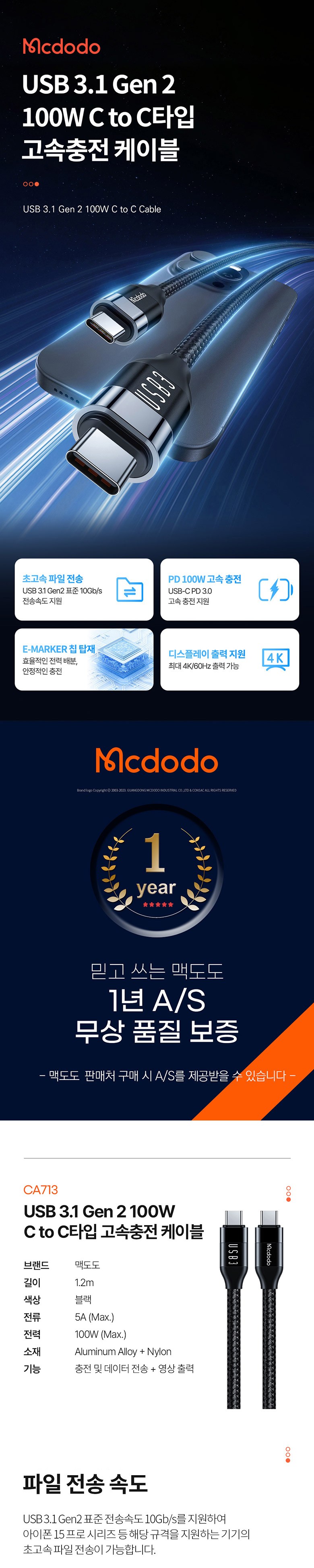 | 품명 및 모델명 | 맥도도 USB 3.1 Gen 2 100W C to C타입 고속충전 케이블 CA713 / HDMI 4K 미러링 / CA-713 | 인증/허가 사항 | 해당없음 |